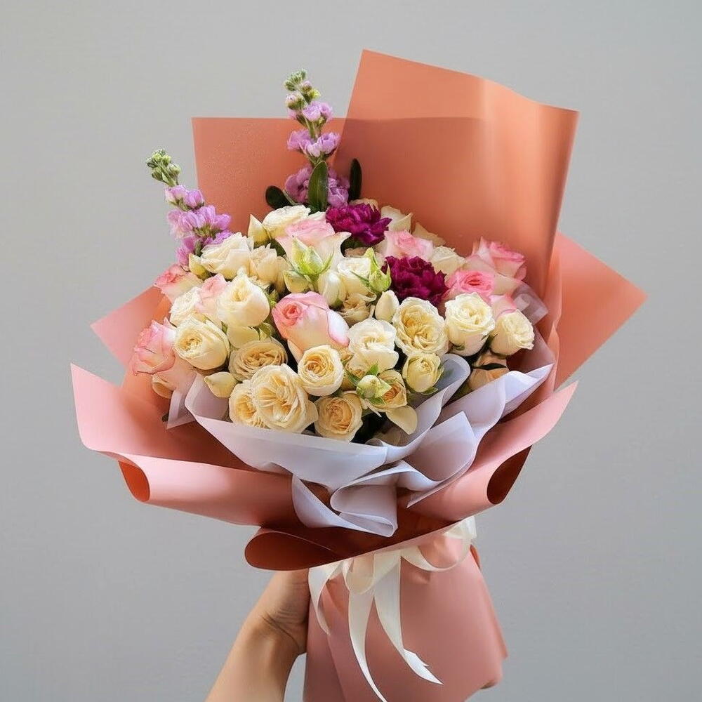 Этот нежный и элегантный букет завораживает своей кремово-слоновой палитрой, мягкими розовыми акцентами и выразительными штрихами насыщенных ягодных тонов. Идеально подходит для дней рождения, юбилеев, помолвок, свадеб, Дня матери или в качестве изысканного подарка «спасибо», он приносит тепло и утонченность в любое торжество. В композиции — пышные спрей-розы, классические розы и насыщенные гвоздики, создающие объемную многослойную композицию, полную текстуры и очарования. Высокие стебли маттиолы придают элегантность и высоту, а свежая зелень усиливает естественную грацию букета. Чтобы цветы дольше оставались свежими, поместите букет в прохладную чистую воду сразу после получения. Обрезайте каждый стебель на 1–2 см ежедневно и удаляйте любые листья ниже уровня воды. Держите букет вдали от солнца и источников тепла, чтобы сохранить его красоту на многие дни.
