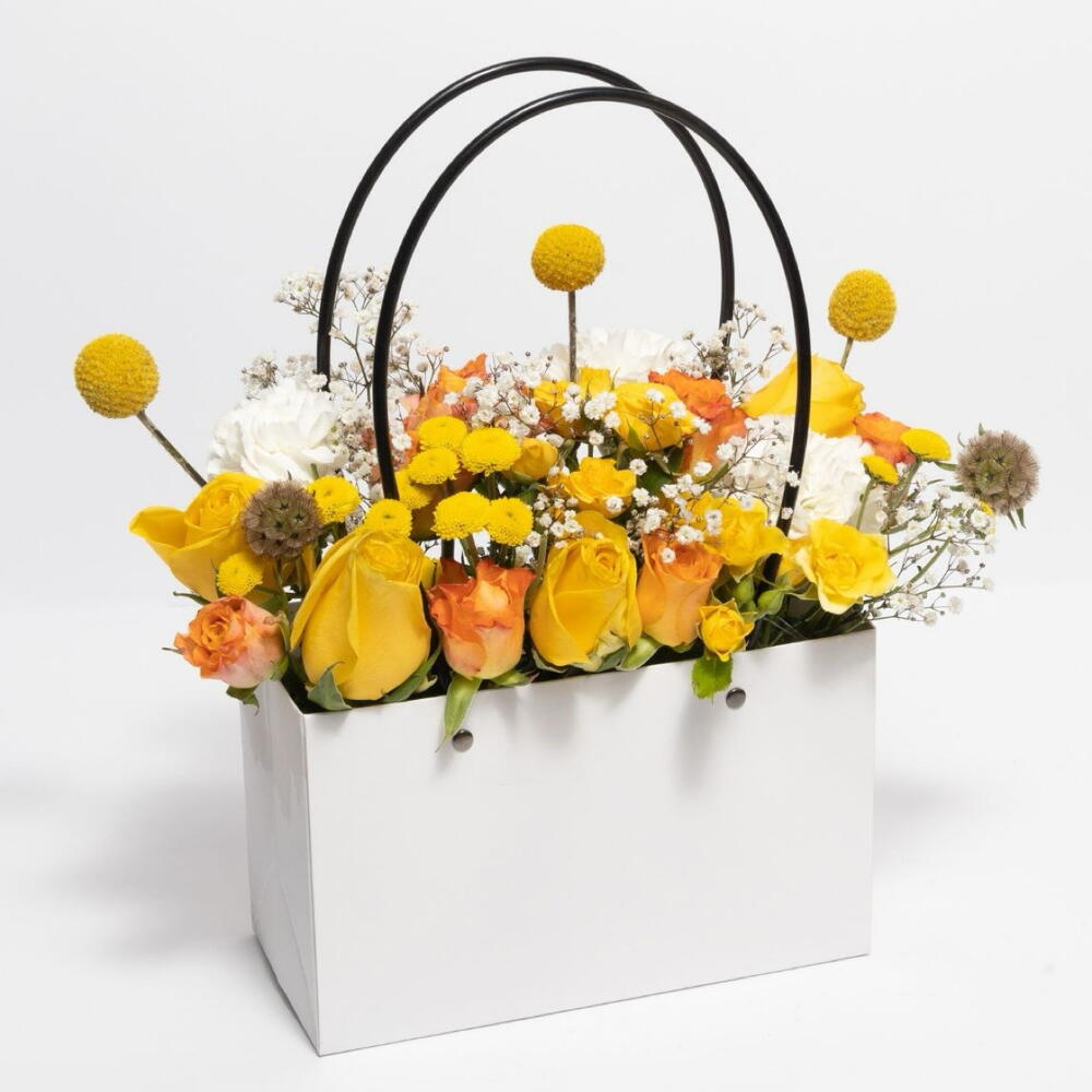 В белой корзине, наполненной 15-ю желтыми, оранжевыми и белыми розами в сочетании со специальными натуральными аксессуарами, это идеальный подарок для тех, кому нужно немного покоя и безмятежности в своей жизни.