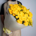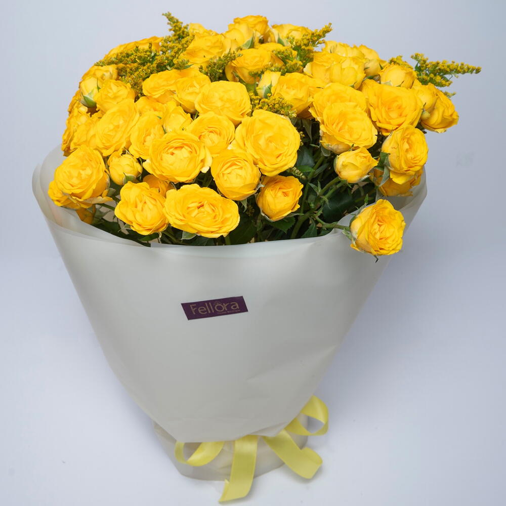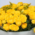 Букет из желтых мини-роз с солидаго. Упакован и перевязан лентой