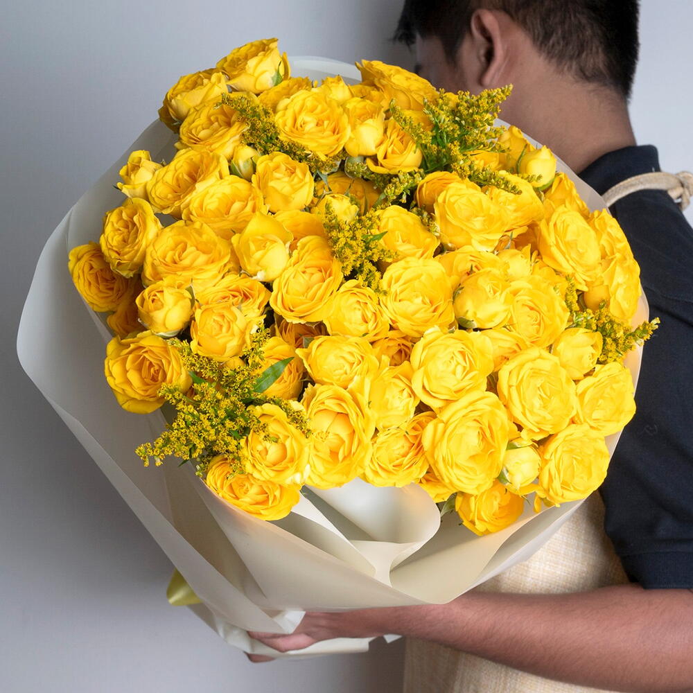 Ribbon - 1 шт. Solidago - 5 шт. жёлтая миниатюрная роза - 16 шт. оберточная бумага молочно-белого цвета - 4 шт.