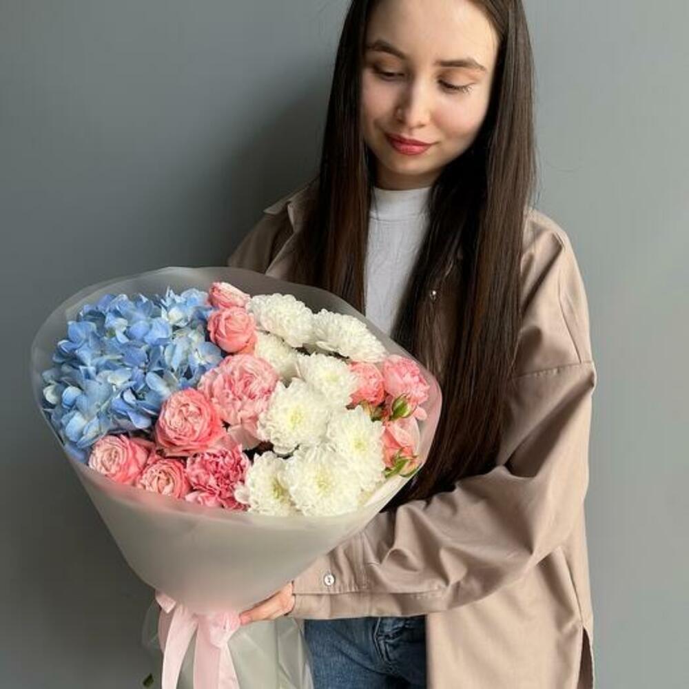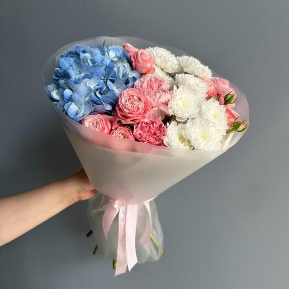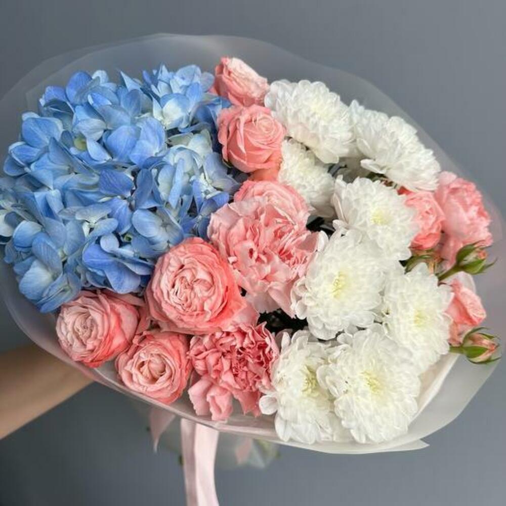 Представляем букет Serene Dream, потрясающую композицию, сочетающую умиротворяющие оттенки голубой гортензии, романтический акцент розовых роз и чистую элегантность белых хризантем. Этот букет идеален для любого особого повода, даря получателю ощущение покоя и радости. Голубая гортензия символизирует изящество и красоту, а розовые розы выражают восхищение и благодарность. Белые хризантемы добавляют нотку чистоты и простоты, создавая гармоничное сочетание цветов и эмоций. Пусть безмятежная красота этого букета привнесёт радость и спокойствие в любой момент.
