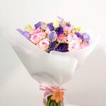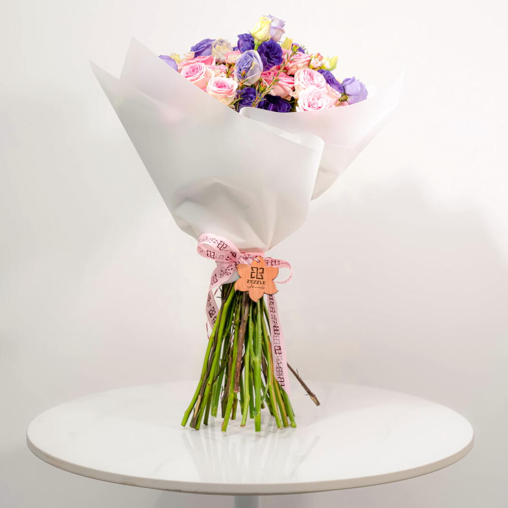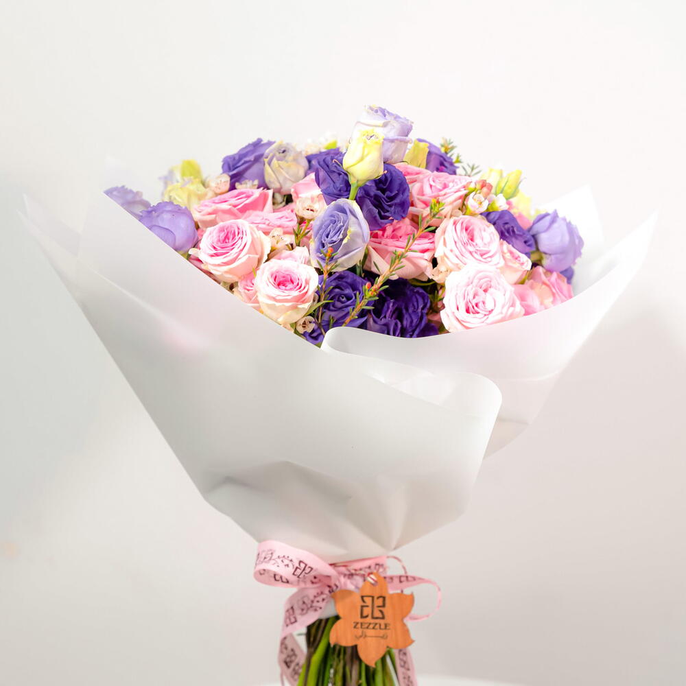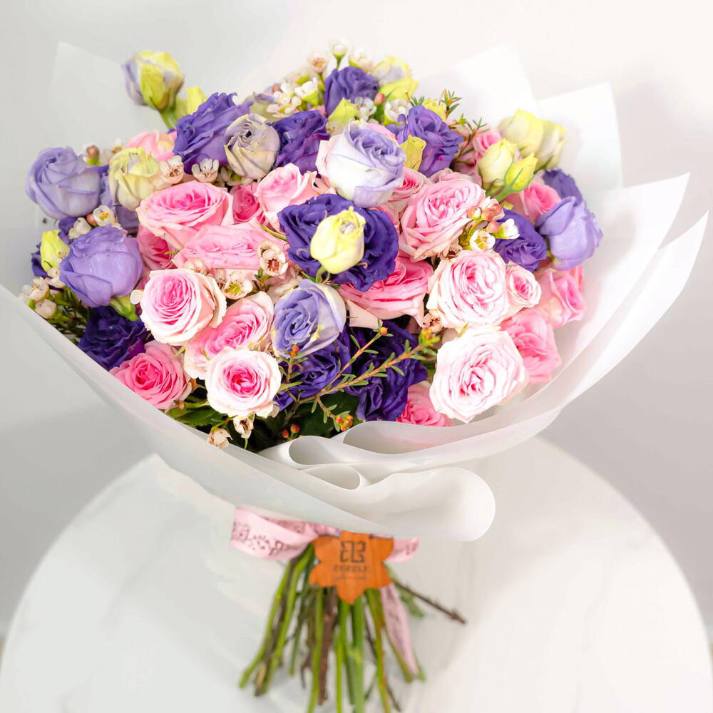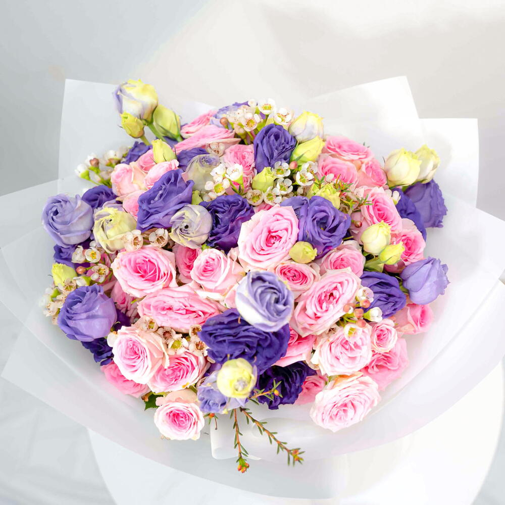 Спокойный и элегантный букет «Безмятежность» состоит из 10 нежных фиолетовых эустом, 10 нежно-розовых кустовых роз и 5 белоснежных амброузов. Гармоничное сочетание цветов и текстур создаёт умиротворяющую и изысканную композицию. Изящные цветы эустомы, нежные лепестки кустовых роз и воздушная лёгкость амброузов создают поистине захватывающий дух букет. Идеально подходит для выражения сочувствия, благодарности или просто для того, чтобы поднять кому-то настроение.
