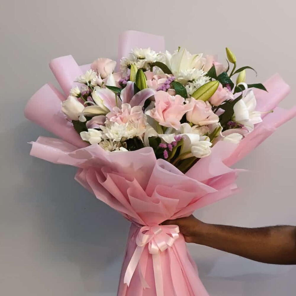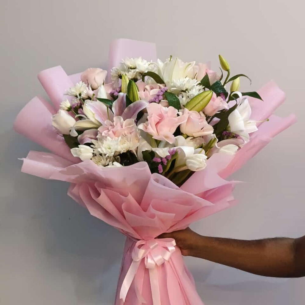 Pink rose - 7 шт. White rose - 5 шт. белые хризантемы - 3 шт. лилия розовая и белая - 5 шт.