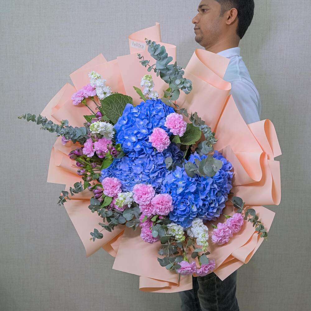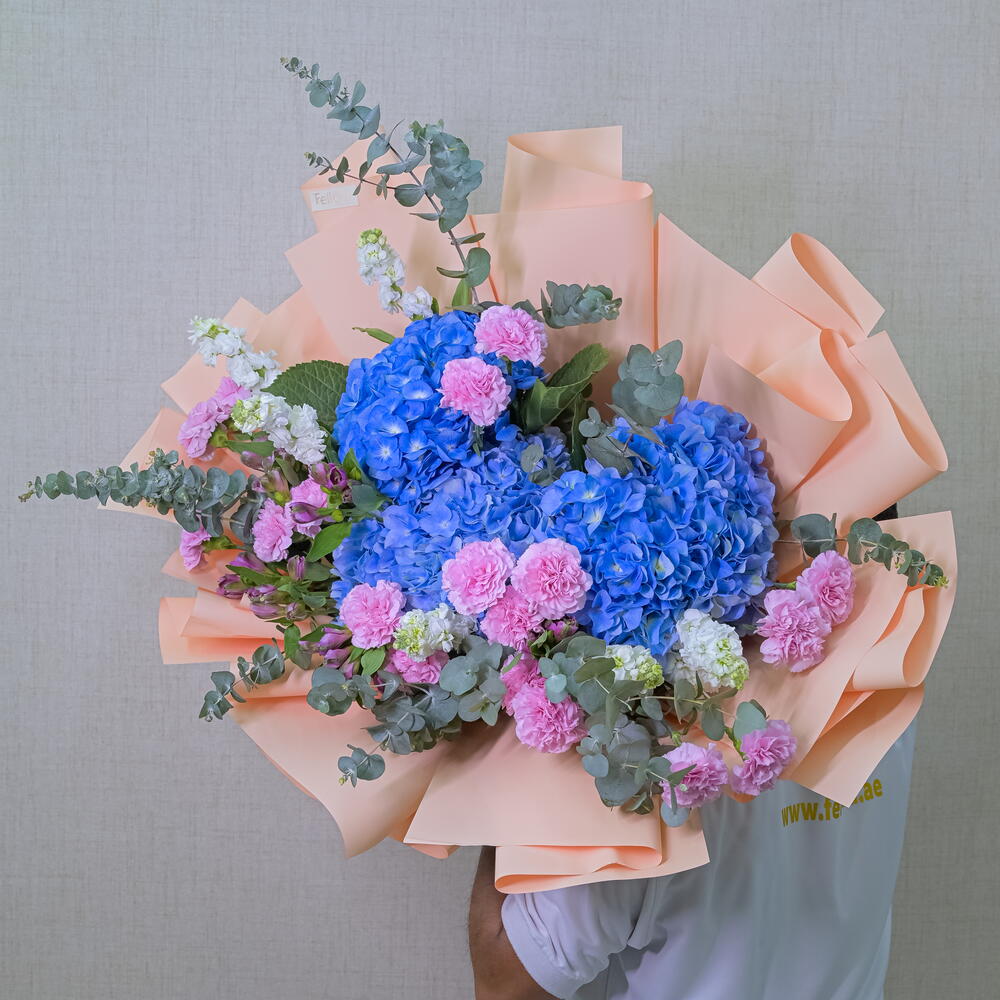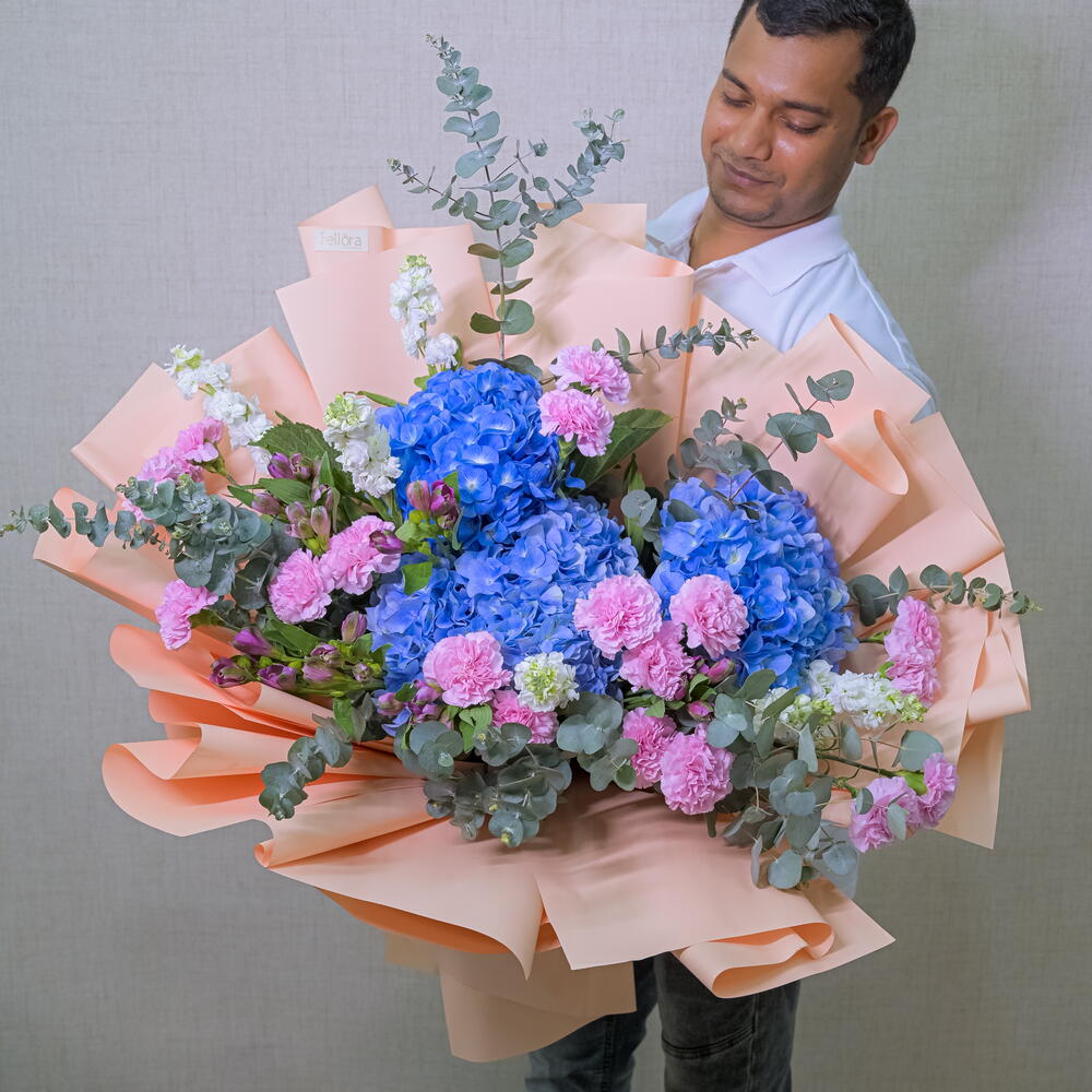 Украсьте любое торжество нашим букетом «Сад безмятежности», пленительным сочетанием элегантности и очарования. В эту изысканную композицию входят следующие цветы: Голубая гортензия: Символизируя изящество и красоту, эти пышные цветы добавляют нотку изысканности и глубины. Белая матиола: Известная своим восхитительным ароматом, эта роза дарит чистоту и свежий, манящий аромат. Светло-фиолетовые гвоздики: Эти нежные, нежные лепестки, символизирующие восхищение и очарование, добавляют нежный штрих цвета. Фиолетовые альстромерии: Эти яркие цветы, символизирующие дружбу и преданность, привносят тепло и радость. Эвкалипт: Эти листья, добавляя освежающую зелень, дополняют букет своим успокаивающим ароматом и элегантным видом. Букет «Сад безмятежности» идеально подходит для дней рождения, годовщин или просто для того, чтобы поднять кому-то настроение. Гармоничное сочетание синего, белого и фиолетового цветов создаёт умиротворяющую и чарующую композицию, делая её незабываемым подарком на любой случай. Пусть букет «Сад безмятежности» привнесёт частичку природной красоты и спокойствия в дом ваших близких.