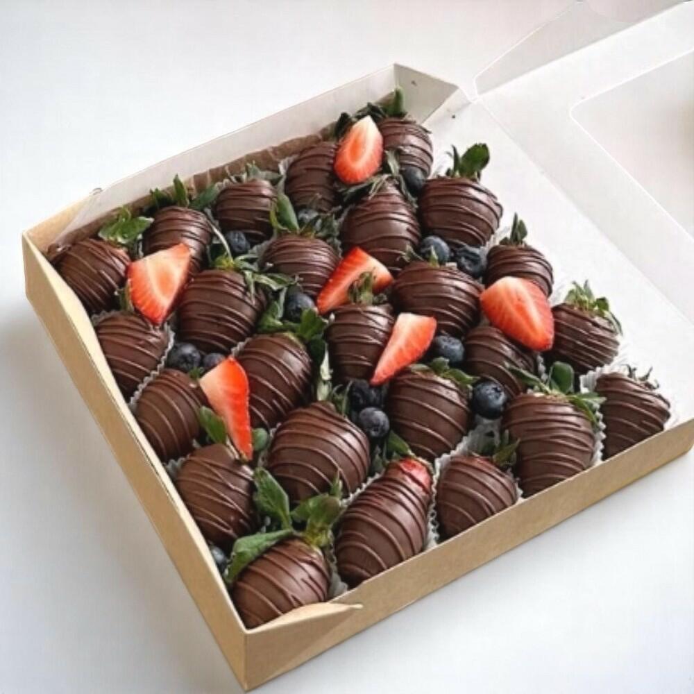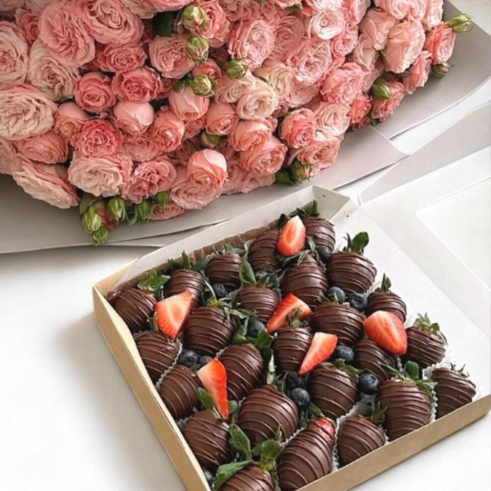 The perfect pairing of beauty and indulgence — this gift set includes a lush bouquet of pastel pink spray roses and a box of fresh strawberries dipped in rich dark chocolate. The bouquet overflows with romantic charm, while the berries, decorated with delicate chocolate drizzle and fresh blueberries, add a touch of gourmet sweetness. Ideal for birthdays, anniversaries, or simply to say “I adore you,” this combo delights both the eyes and the taste buds. Store the bouquet in clean water away from heat and keep the berries refrigerated until serving.