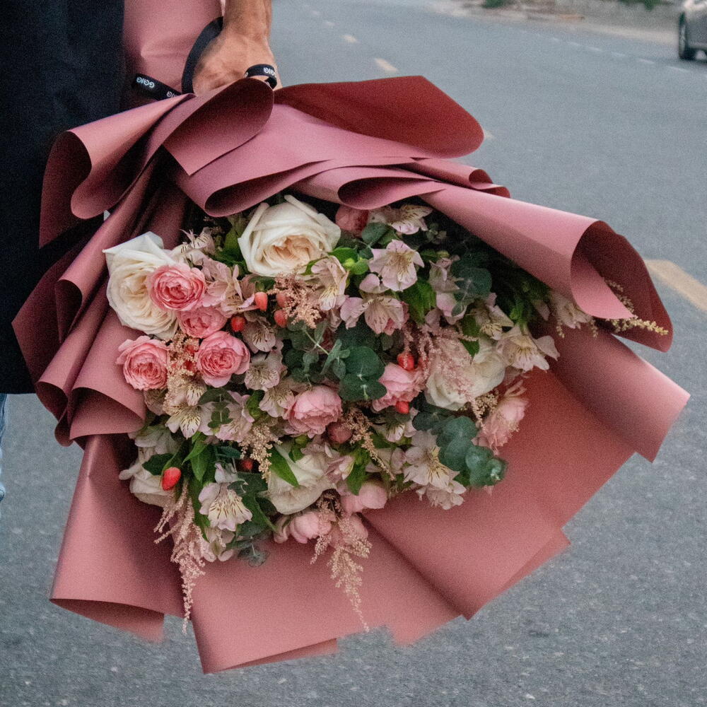 Eucalyptus - 4 шт. Spray rose - 5 шт. astilbe - 5 шт. Белая Охара - 5 шт. розовая альстромерия - 8 шт. гиперикум - 5 шт.