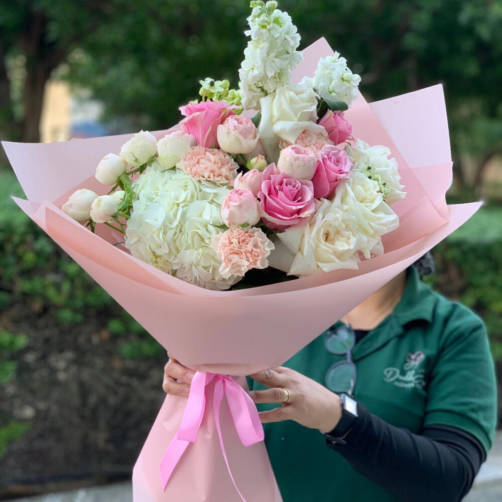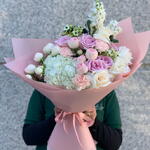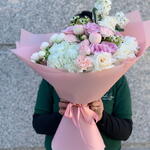 Ornithogalum - 2 шт. Hydrangea - 1 шт. Pink rose - 5 шт. carnation - 3 шт. matthiola - 2 шт. ohara - 3 шт. peony rose mansfield - 3 шт.