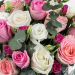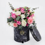 Насладитесь очарованием этой элегантной круглой шкатулки из черного мрамора, наполненной потрясающим сочетанием пастельных и ярких роз. В этом букете сочетаются оттенки нежно-розового, цвета слоновой кости, фуксии и кремового, а также нежные лизиантусы и ароматный эвкалипт. Стильная шляпная коробка добавит роскоши и идеально подойдет для дня рождения, романтических жестов или торжеств. Яркая, но нежная цветовая палитра вызывает чувства радости, благодарности и нежности. Храните шкатулку в прохладном месте, слегка опрыскивайте цветы каждые 1–2 дня и избегайте попадания прямых солнечных лучей, чтобы дольше сохранить свежесть и красоту.