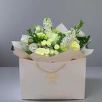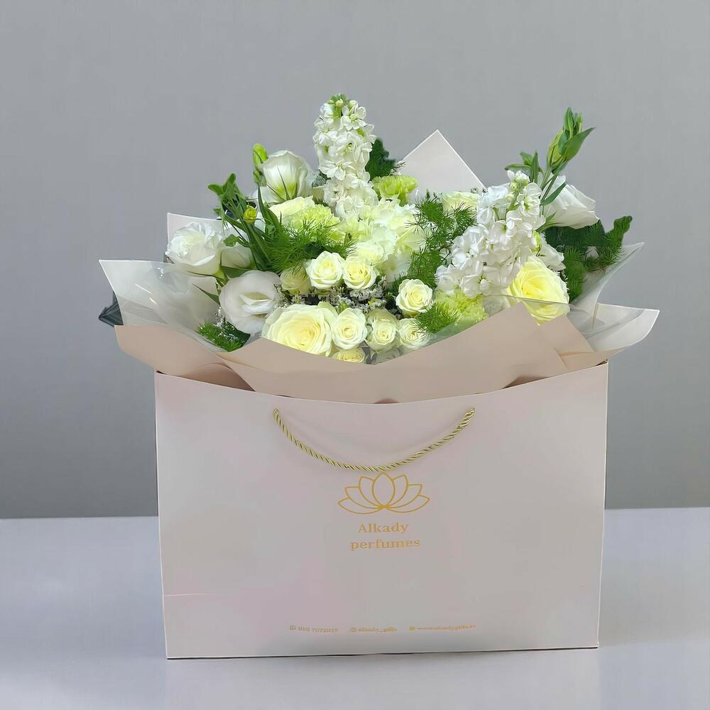 carnation - 5 шт. mathiola - 2 шт. маленькая роза - 4 шт. устьице - 3 шт. roses - 7 шт. гортензия - 1 шт. спрагросс - 2 шт.