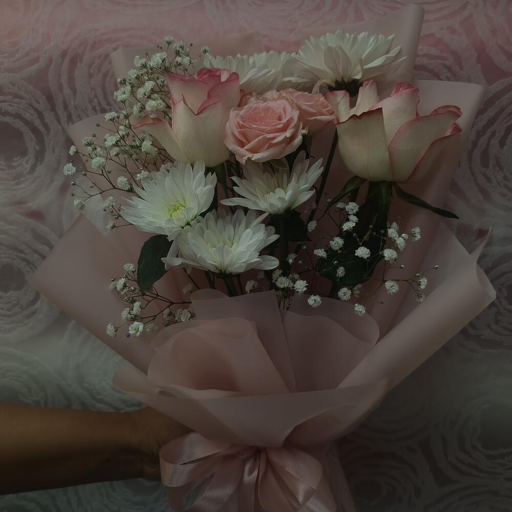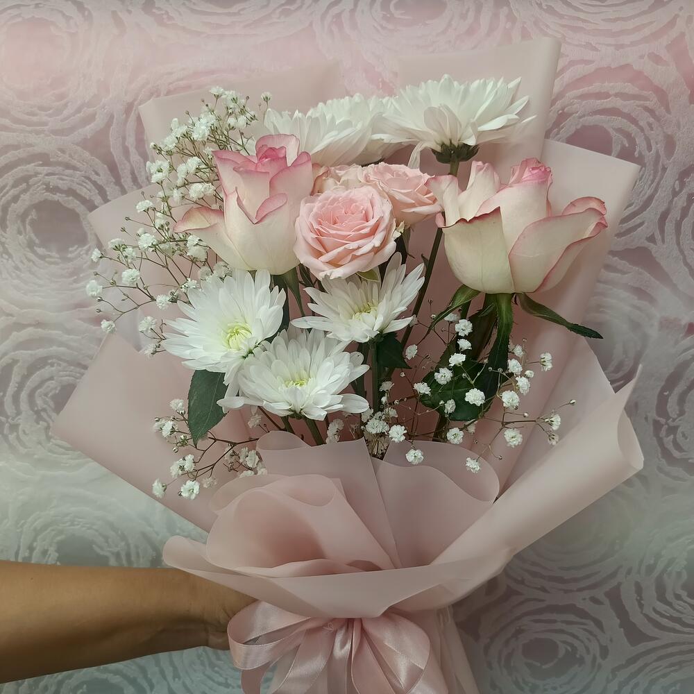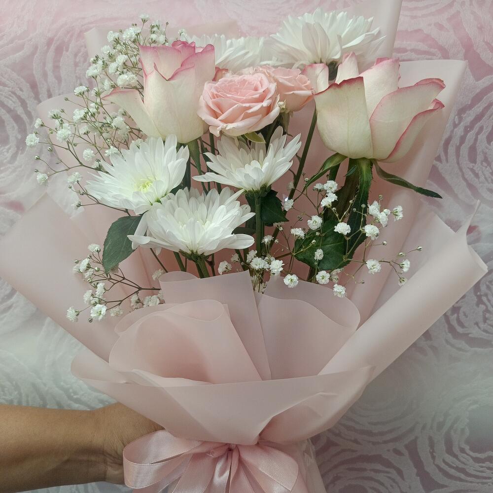 Этот изысканный цветочный букет, представленный в нашей рубрике «Специальные предложения флористов», представляет собой прекрасно сбалансированный ансамбль из 2 светло-розовых роз, одного стебля элегантной белой хризантемы и нежной мини-розы. Букет дополнительно украшен стеблем причудливой гипсофилы, завернутым в качественную бумагу и со вкусом перевязанным атласной лентой. Сочетание мягких оттенков и разнообразных фактур делает этот букет выражением утончённого вкуса и изящной простоты. Идеально подходит для любого повода, он наверняка произведёт неизгладимое впечатление.