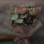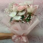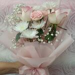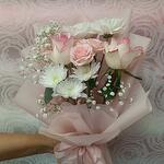 light pink rose - 2 шт. ribbon satin - 1 шт. wrapping paper - 4 шт. маленькая роза - 1 шт. хризантема белый стебель - 1 шт. стебель гипсофилы - 1 шт.