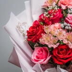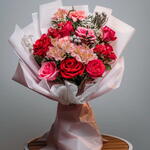 Brunia - 2 шт. Spray rose - 2 шт. Alstroemeria - 3 шт. Pistacia - 2 шт. Gypsophila - 2 шт. rose - 8 шт. carnation - 2 шт.