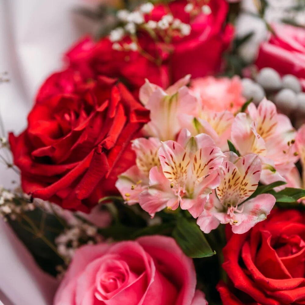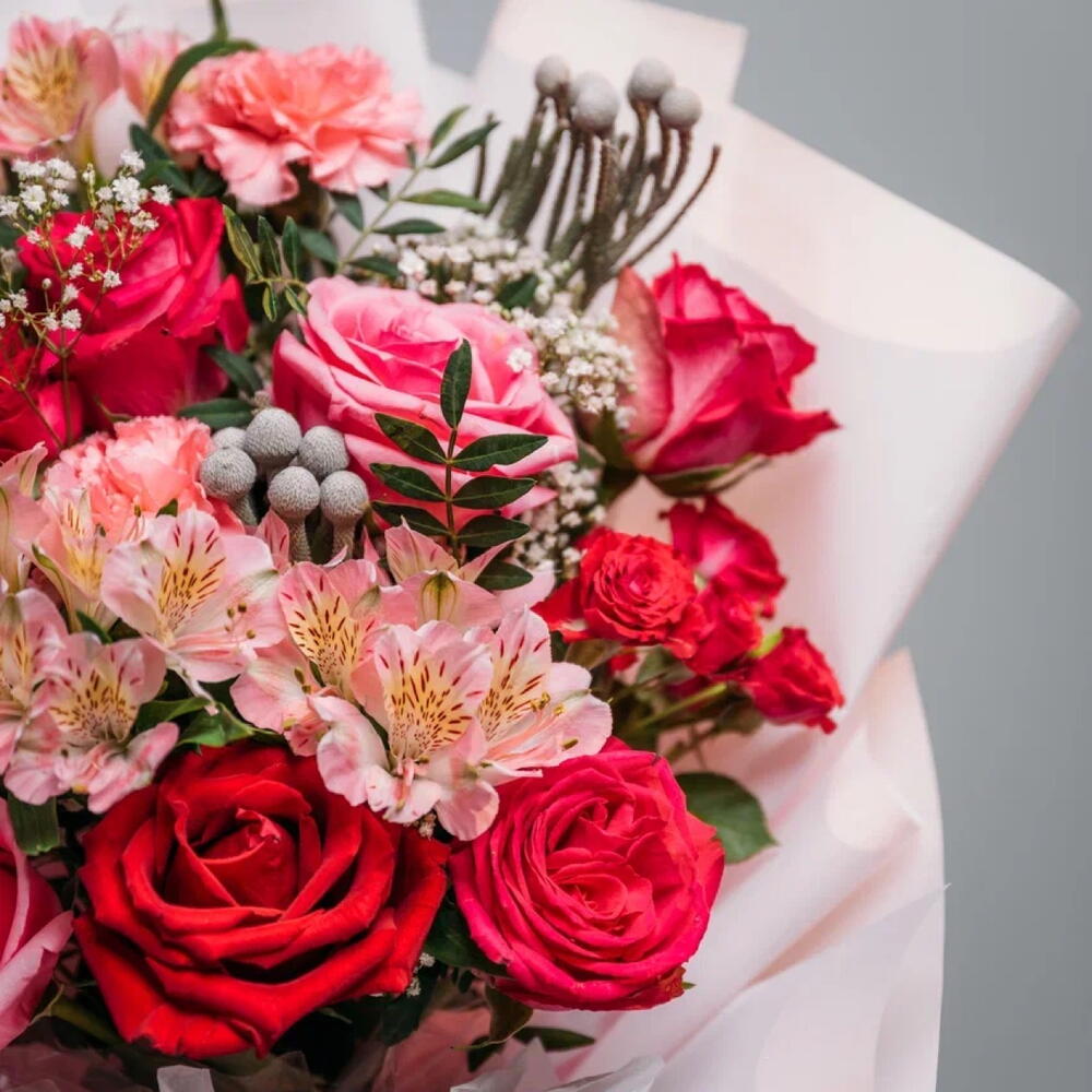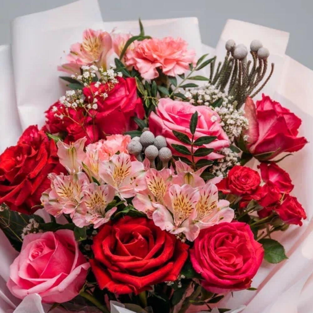Brunia - 2 шт. Spray rose - 2 шт. Alstroemeria - 3 шт. Pistacia - 2 шт. Gypsophila - 2 шт. rose - 8 шт. carnation - 2 шт.