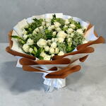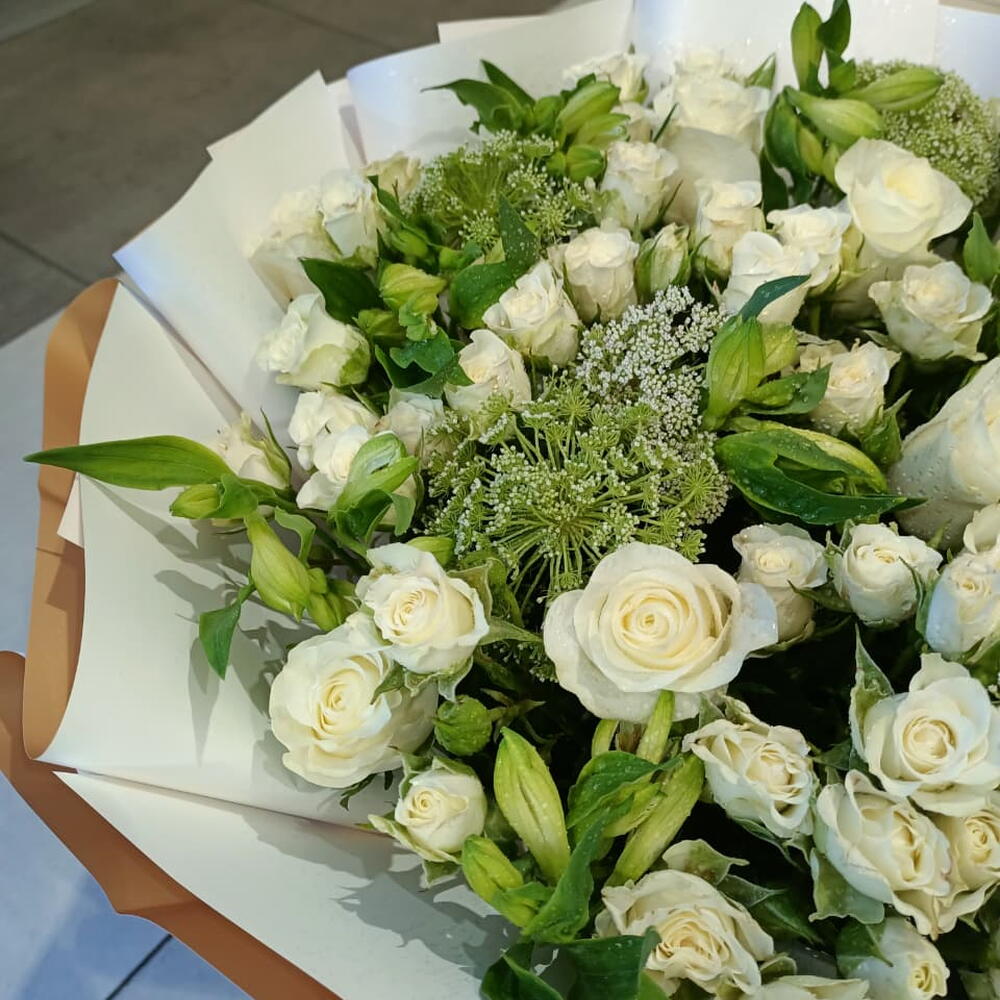 Этот великолепный, крупномасштабный букет представляет собой пышное море белоснежных роз, перемежающихся нежными веточками зеленой дикой розы и свежей зеленью, создающими естественную, вдохновленную садом текстуру. Композиция мастерски оформлена в двухцветную скульптурную обертку из чистого белого и теплого медного цветов, создающую изысканный, контрастный силуэт, который завершается простой белой атласной лентой.