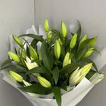 9 стеблей белых лилий с упаковкой и лентой