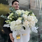 Composition: Alstroemeria - 10, Hydrangea - 5, oasis - 1, box - 1, Mattiola - 8, Dianthus - 8, Eucalyptus mix - 6, Rose white - 10, Rose White Ohara - 7 Sizes: WIDTH - 45CM; HEIGHT - 65CM; LENGTH - 65CM; (including packaging) Размер: 45 x 65 x 65 см