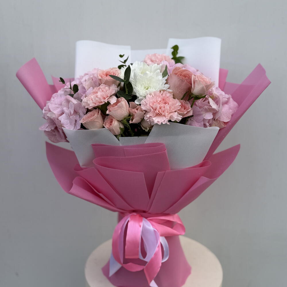 Нежный, мягкий и полный пастельного очарования — этот букет пастельных тонов представляет собой красивый букет из смешанных цветов, обернутый ярко-розовой лентой и украшенный ею, что делает его идеальным подарком. Он составлен из свежих розовых роз, пышных розовых гвоздик, элегантной розовой гортензии и яркой белой хризантемы в центре, которая создает чистый, изысканный контраст. (Возможны небольшие сезонные изменения, но общий стиль и цветовая гамма остаются неизменными.) Это настоящий букет из свежих цветов, созданный из цветов премиум-класса — прекрасный букет для любого особого момента. Он идеально подходит в качестве букета на день рождения (один из лучших вариантов букета на день рождения для любителей пастельных тонов), идеально подходит для цветов на день рождения, а также прекрасно смотрится в качестве поздравительного букета с элегантными цветами. Благодаря мягким розовым тонам и романтическому настроению, это также милый романтический букет, наполненный любовью и романтикой, что делает его отличным вариантом для цветов на годовщину. Стильный, модный букет, всегда в тренде и поистине уникальный — идеально подойдет тем, кто ищет лучший букет в Дубае.