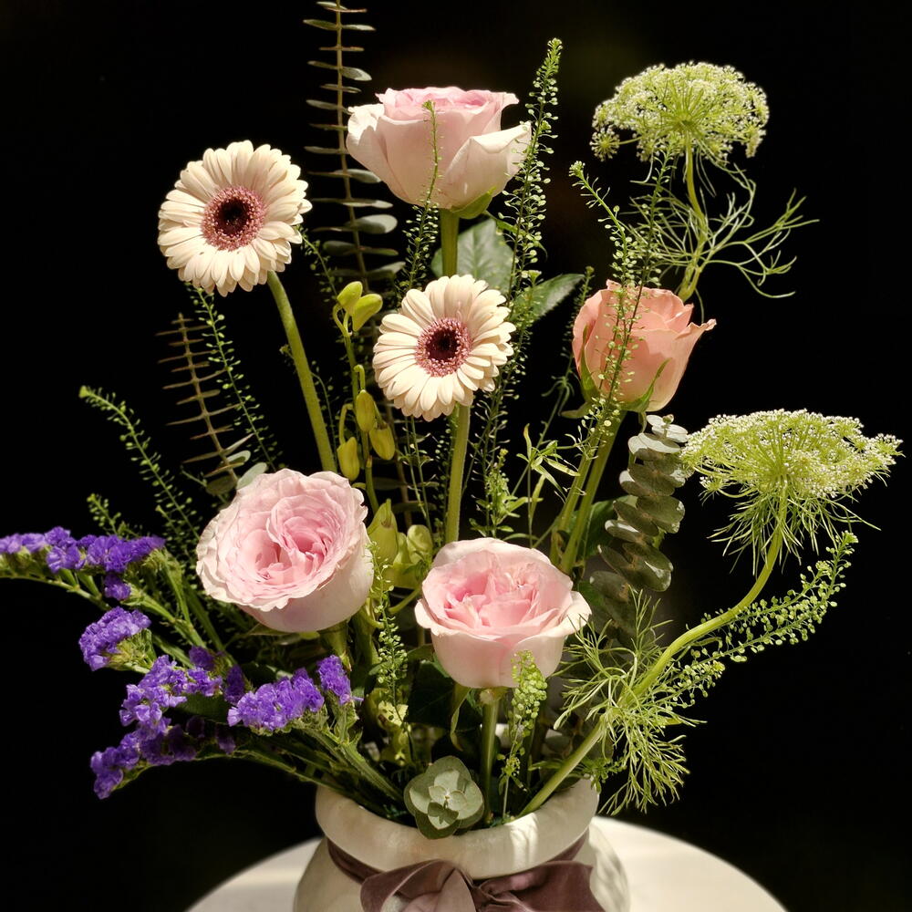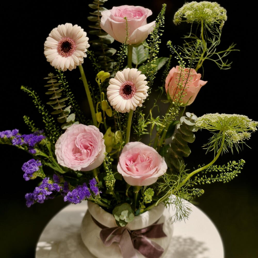 gerbera pink - 2 шт. eucalyptus leaves - 2 шт. амми муджус - 1 шт. стебли розовых роз - 3 шт. стратис - 3 шт.
