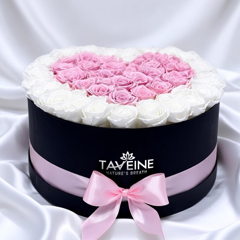 Нежный, утончённый и эмоционально насыщенный — SOFT CODE - Blush Heart Edition — это роскошная композиция из свежих белых и нежно-розовых роз, представленная в элегантной круглой чёрной коробке с румяно-розовой лентой от Tavéine - Nature’s Breath. В этом утончённом дизайне в центре расположено нежно-розовое сердечко, обрамлённое безупречными белыми розами, символизирующими нежность, заботу и искреннюю привязанность. Каждая роза тщательно отбирается по свежести, идеальному раскрытию и премиальному качеству, чтобы при доставке композиция выглядела безупречно. Контраст белых и румяно-розовых тонов с матовой чёрной упаковкой создаёт вневременную эстетику современной роскоши, идеальную для изящного и значимого подарка. SOFT CODE - Blush Heart Edition создана для тех моментов, когда тонкие эмоции говорят громче всего.