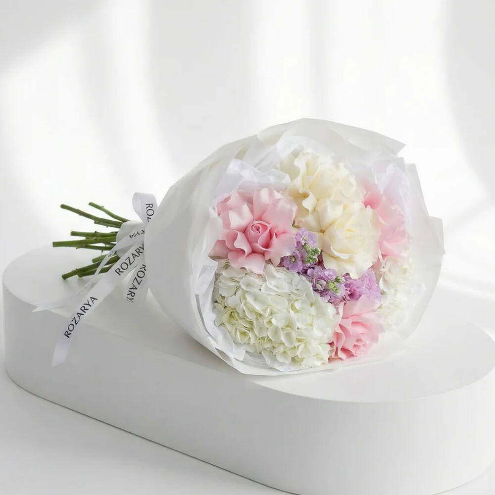 A soft and graceful bouquet in blush pink, white, and lilac tones, designed with hydrangea, roses, and delicate stock. Fresh, airy, and romantic, this bouquet is a beautiful choice for birthdays, Mother’s Day, and elegant everyday gifting. • Please Note: As flowers are natural products, actual colors may vary slightly from digital images due to seasonal growth and lighting conditions. We guarantee that the overall style and premium quality as well as freshness of your arrangement will always be maintained.