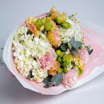 Eustoma - 3 шт. tanacetum - 3 шт. ribbon satin - 1 шт. wrapping paper - 4 шт. white hydrangea - 2 шт. eucalyptus leaves - 3 шт. садовая роза пинк мондиаль - 3 шт.
