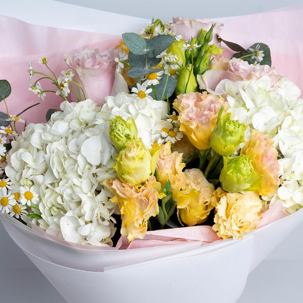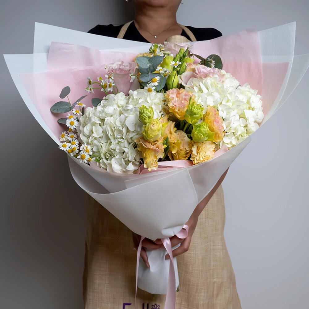 Eustoma - 3 шт. tanacetum - 3 шт. ribbon satin - 1 шт. wrapping paper - 4 шт. white hydrangea - 2 шт. eucalyptus leaves - 3 шт. садовая роза пинк мондиаль - 3 шт.