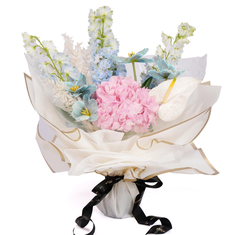 Нежная смесь светло-голубых дельфиниумов, нежно-розовой гортензии, белого антуриума и тюльпанов, окрашенных в голубой цвет, с акцентом на натуральный лагурус для мечтательной композиции, вдохновлённой пастелью.