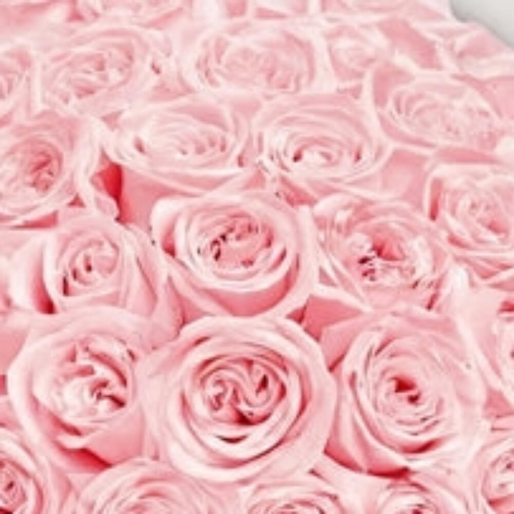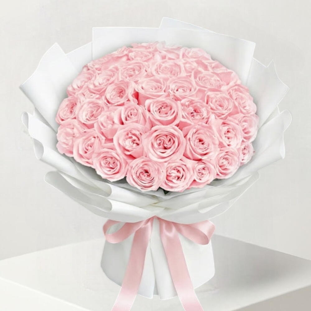 Большой роскошный букет светло-розовых роз, плотно собранных в округлую куполообразную форму. Розы имеют мягкие бархатистые лепестки и часто продаются в композициях примерно по 51 розе в качестве впечатляющего жеста восхищения, изящества и глубокой признательности.