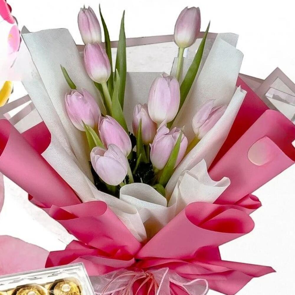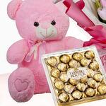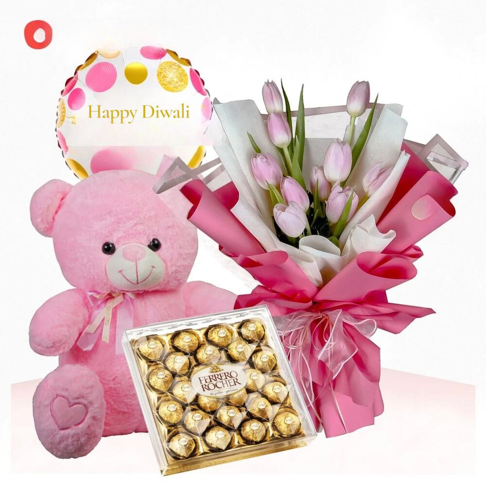 Teddy bear - 1 шт. pink tulips - 20 шт. коробка шоколадных конфет ferrero rocher - 1 шт. шар на Дивали - 1 шт.
