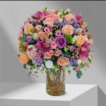 Потрясающая композиция из свежих сезонных цветов, демонстрирующая завораживающее сочетание оттенков, фактур и ароматов. От нежных лилий до ярких подсолнухов — этот шедевр наполнит любое пространство жизнью и элегантностью.