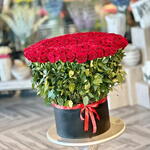 Погрузитесь в романтику 200 длинностебельных красных роз, искусно оформленных и представленных в завораживающей круглой коробке. По-настоящему незабываемый подарок.