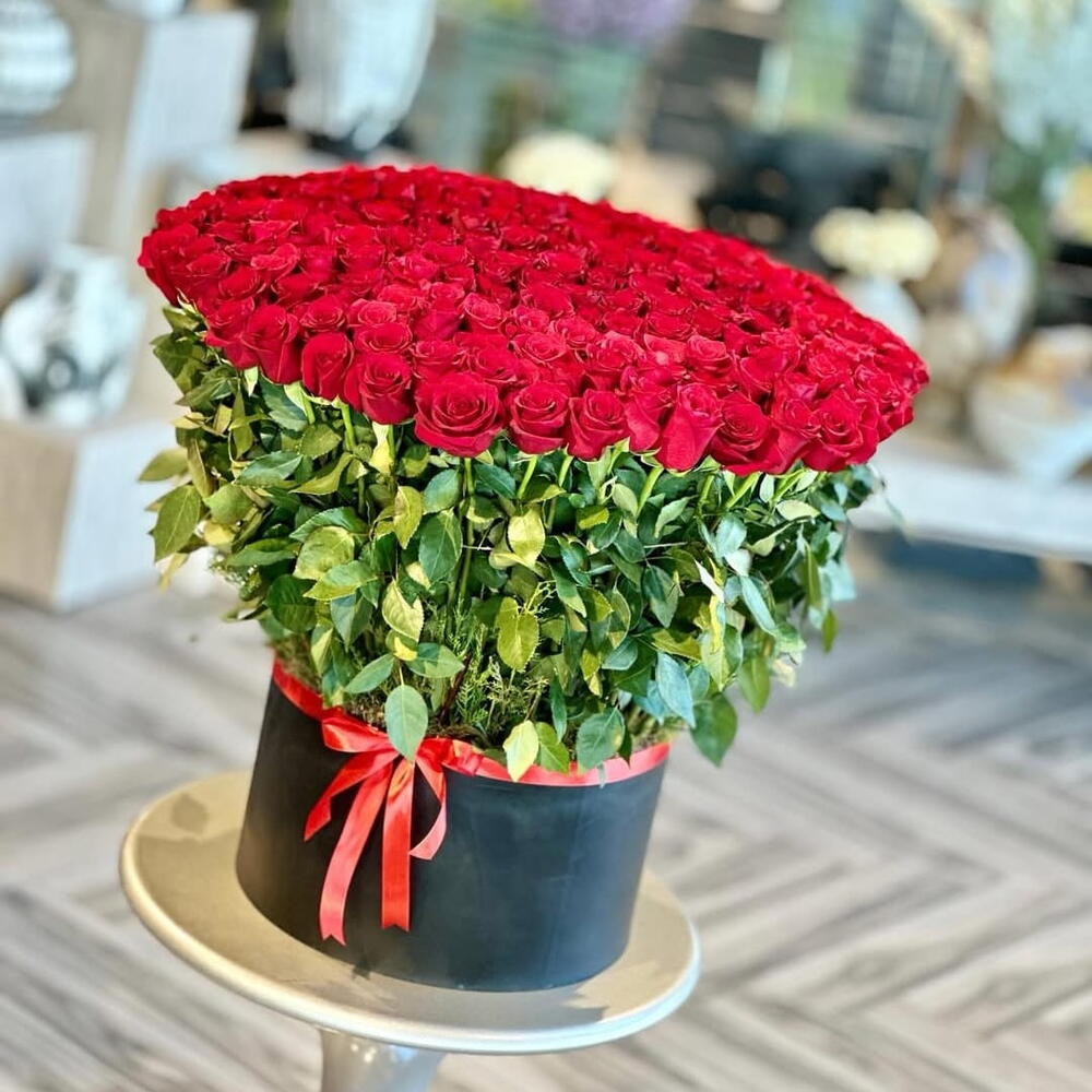 Погрузитесь в романтику 200 длинностебельных красных роз, искусно оформленных и представленных в завораживающей круглой коробке. По-настоящему незабываемый подарок.