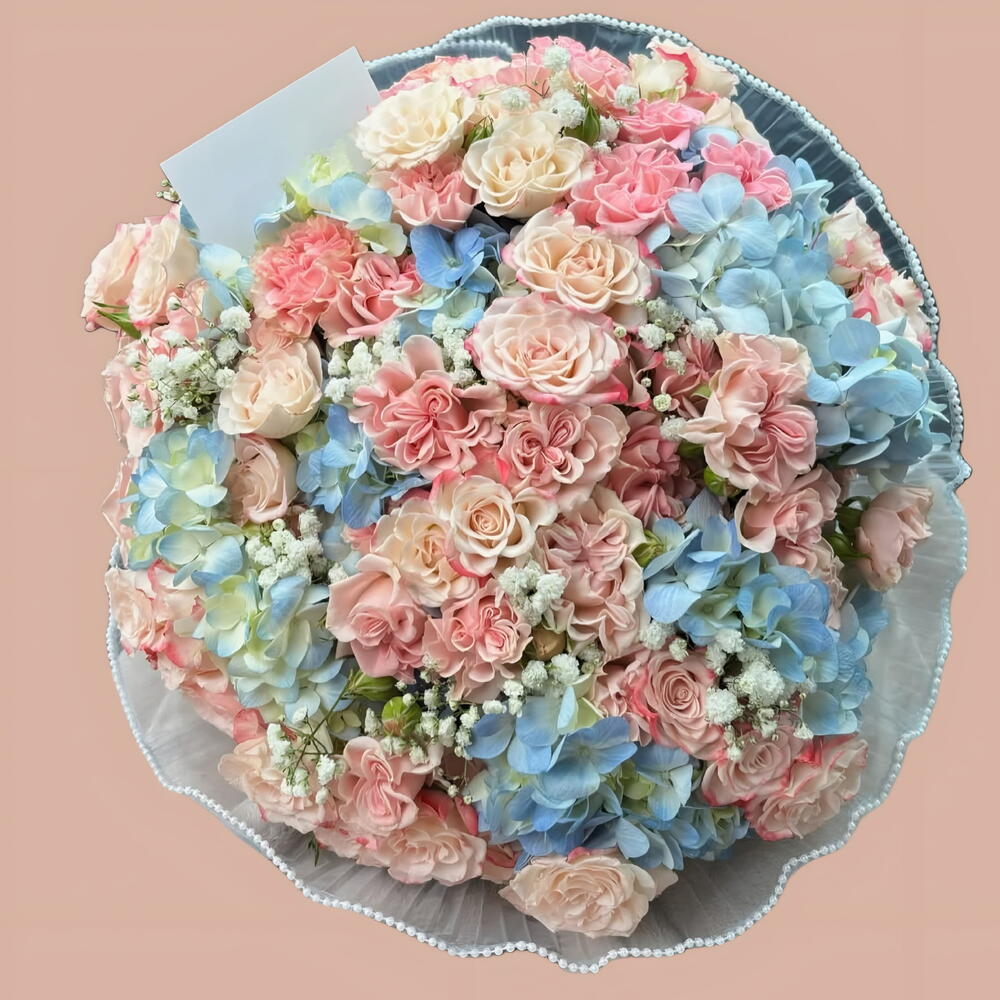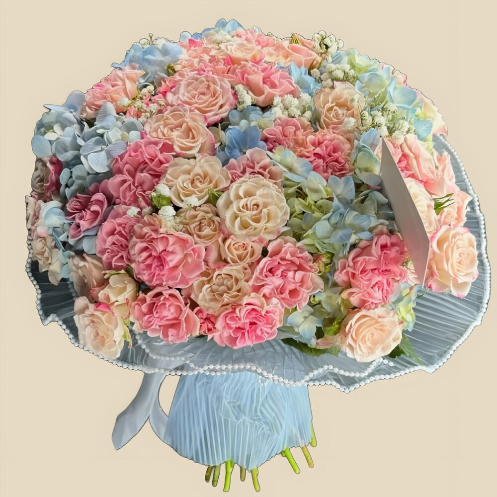 Представьте сад, переполненный цветом! Этот изысканный букет представляет собой яркое сочетание кустовых роз в радужной палитре оттенков, ниспадающих рядом с пышными гортензиями и нежными акцентами. Это настоящее торжество красоты природы.