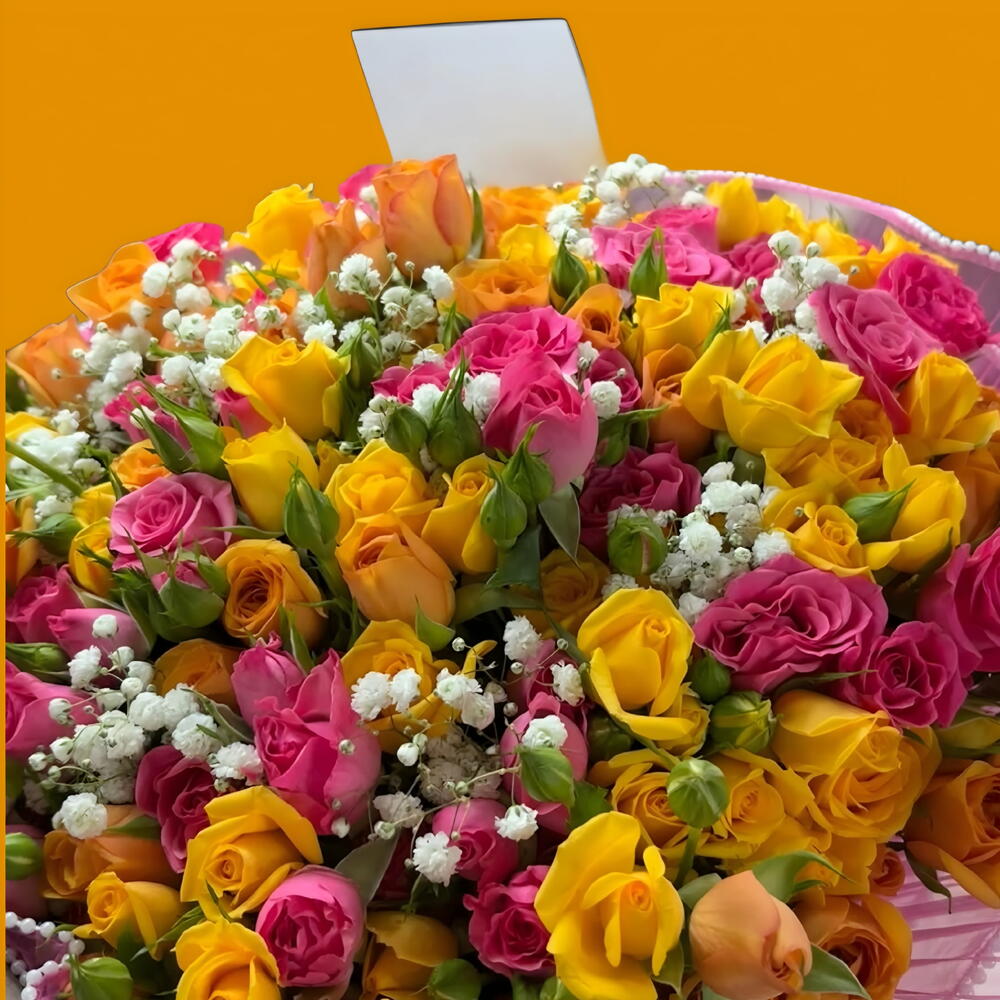 Симфония цвета и текстуры: этот очаровательный букет представляет собой яркую смесь спрей-роз в калейдоскопе оттенков, деликатно переплетённую с лёгкой воздушной гипсофилой для нотки эфирной красоты.