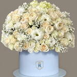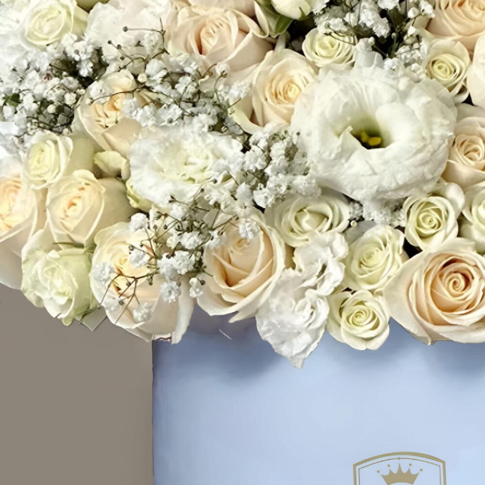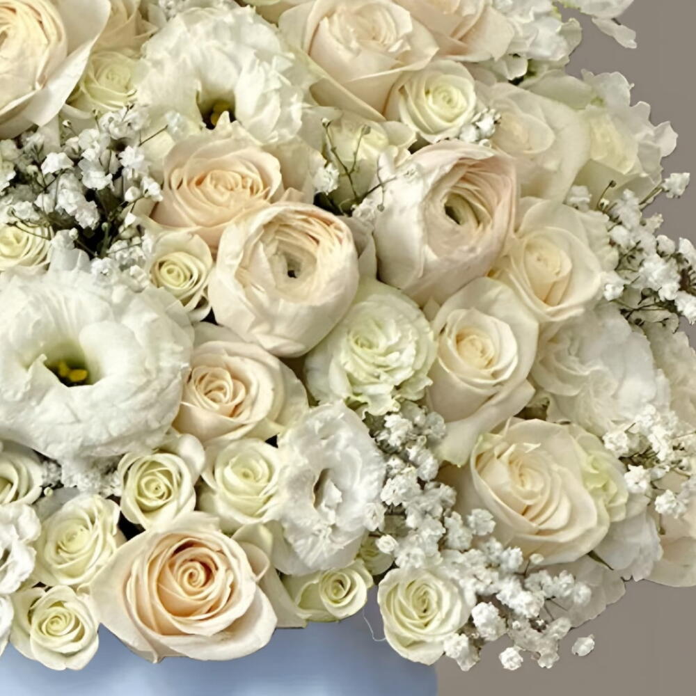 Ощутите спокойствие безупречной палитры. Эта изысканная композиция в коробке демонстрирует гармоничное сочетание белых цветов, излучающих чистоту и умиротворение.