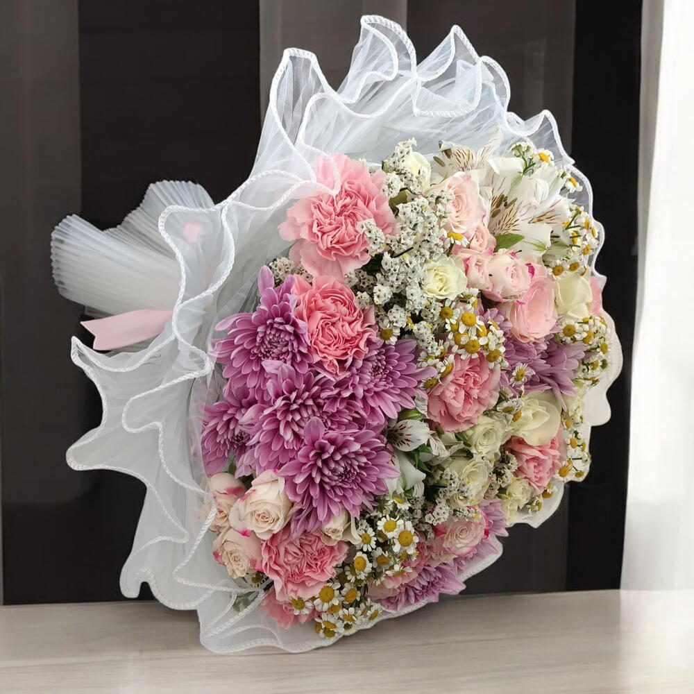 Aster - 4 шт. carnations - 5 шт. карта - 1 шт. roses - 4 шт. мини-розы - 4 шт. сетчатая упаковка - 1 шт. кразантимо - 3 шт.