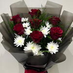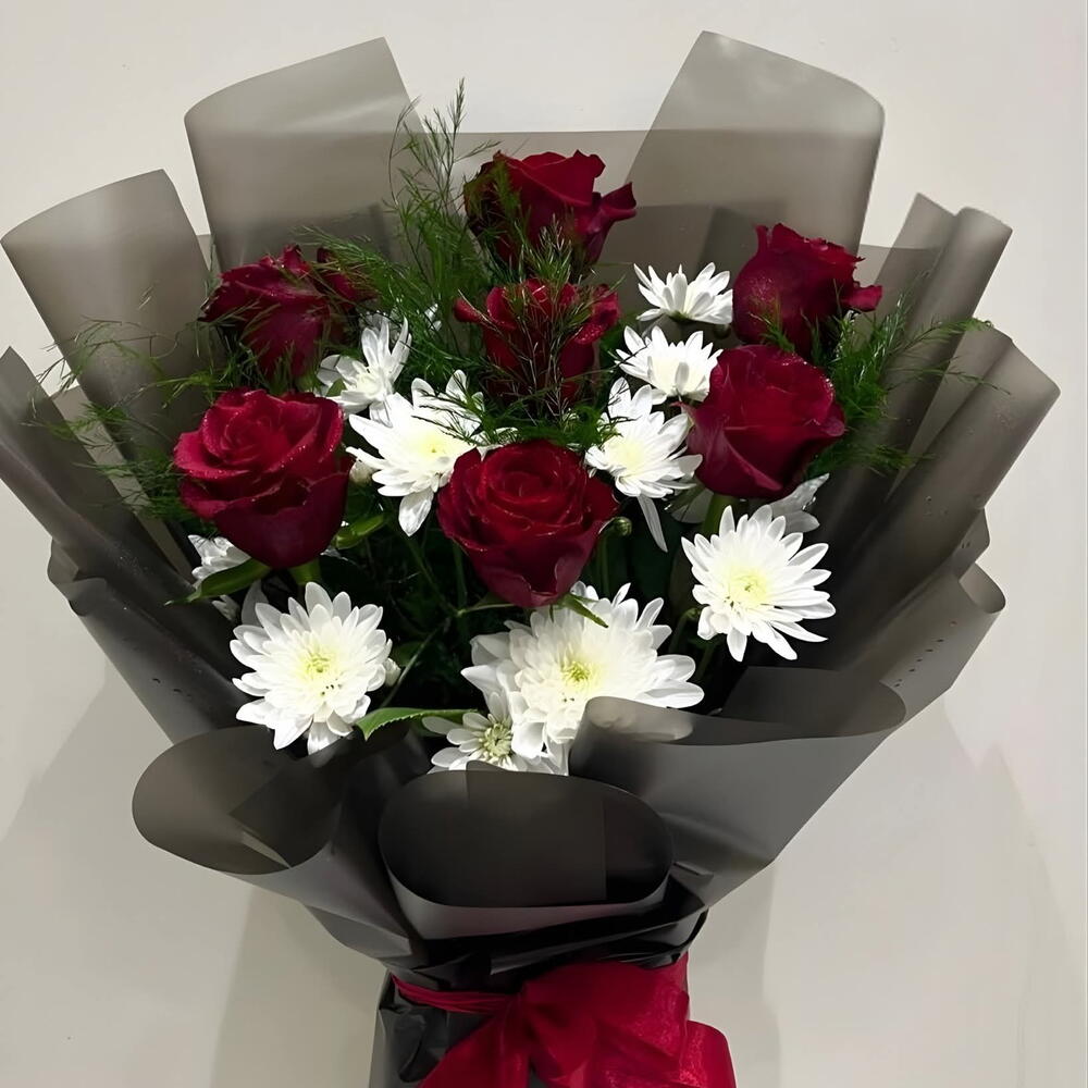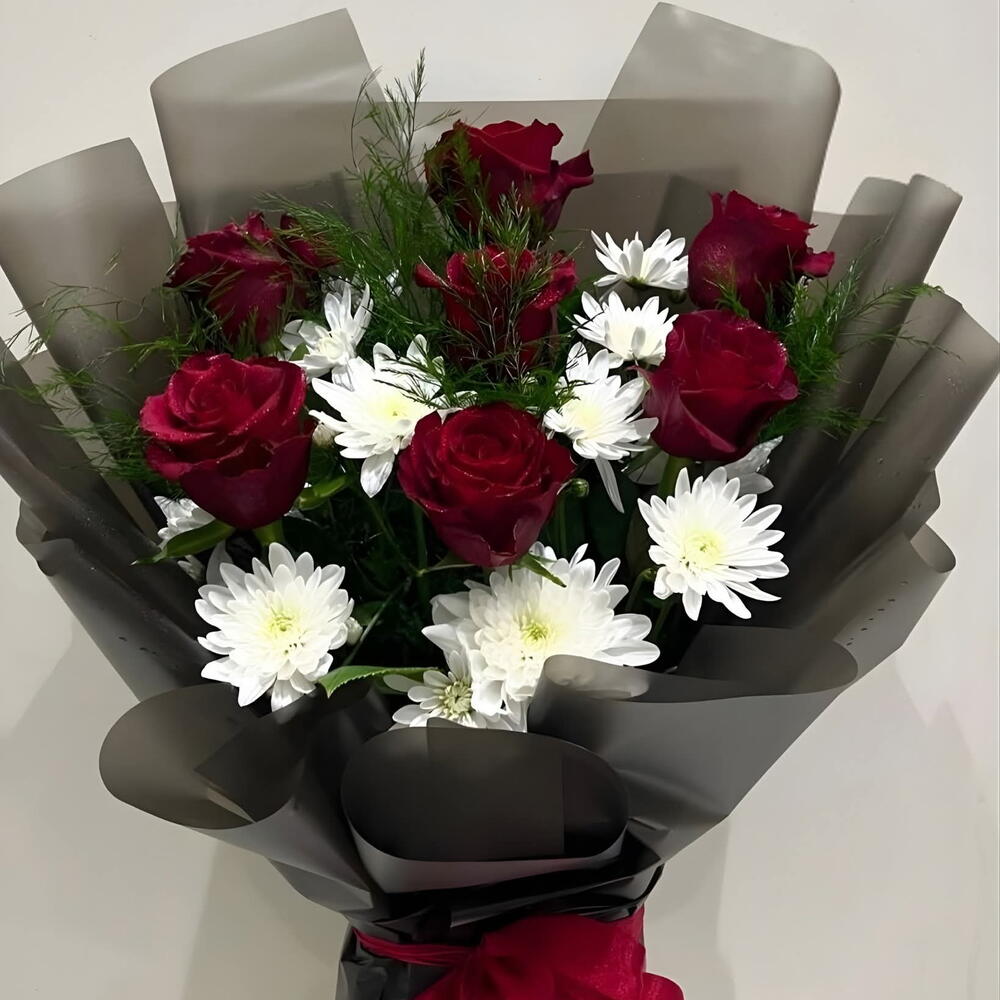 Цветы собраны в плотную округлую форму и профессионально упакованы в высококачественную глянцевую чёрную или тёмно-серую бумагу. Основание стеблей надёжно перевязано сочетающейся красной лентой, добавляя заключительный штрих изящества и делая букет готовым к дарению. Такое сочетание создаёт впечатляющий визуальный эффект, идеально подходящий для таких мероприятий, как годовщины или дни рождения.