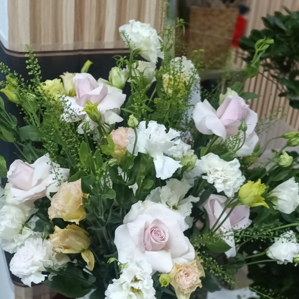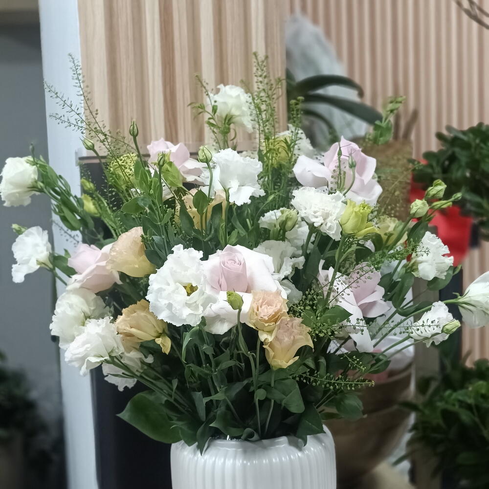 Сделайте свой день ярче с этим изысканным букетом из Florists Specials! Тщательно отобранный, букет сочетает 5 очаровательных стеблей розового лизиантуса и 5 безупречно белых стеблей лизиантуса для восхитительного цветового контраста. Его дополняют 5 пышных зелёных веточек, вносящих элемент свежести. Это великолепное сочетание цветов с лёгкостью дарит яркость и радость, делая его идеальным выбором для любого случая или просто прекрасным дополнением к вашему пространству.