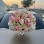 rose pink - 20 шт. carnation pink - 15 шт. hydrangea white - 7 шт. glass vase - 1 шт. julietta - 10 шт. гвоздика зелёная - 15 шт.