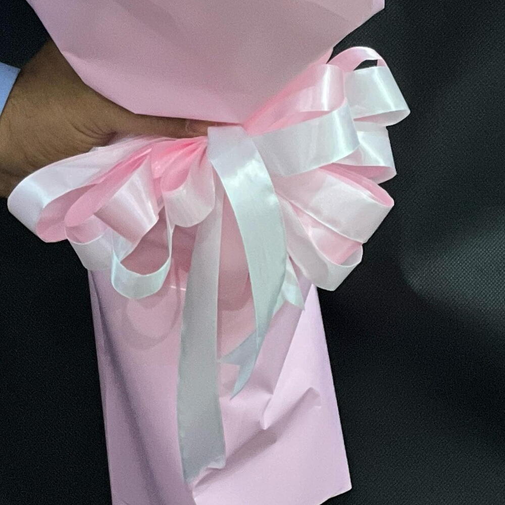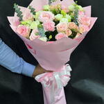 Ribbon - 1 шт. Eucalyptus - 5 шт. Wrapping - 5 шт. carnation pink - 5 шт. lisianthus white - 3 шт. букет роз в брызгах - 3 шт. pink roses - 5 шт. white roses - 3 шт.