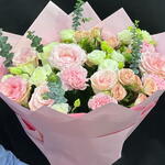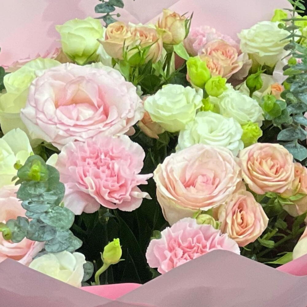 Насладитесь манящей красотой этого монобукета. Букет, состоящий из 5 нежно-розовых роз, 3 белоснежных лизиантуса, 5 нежно-розовых гвоздик, 3 очаровательных кустовых роз и 3 белых роз, излучает элегантное очарование. Пять веточек эвкалипта добавляют нотку свежести в живописную композицию. Всё это бережно упаковано в 5 изысканно подобранных упаковок с одной лентой, создающей идеальный завершающий штрих. Выразите свою всеобъемлющую любовь с помощью этого изысканно подобранного букета цветов. Этот букет – яркое свидетельство вашего утонченного вкуса и нежности.
