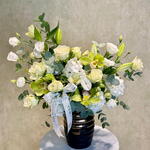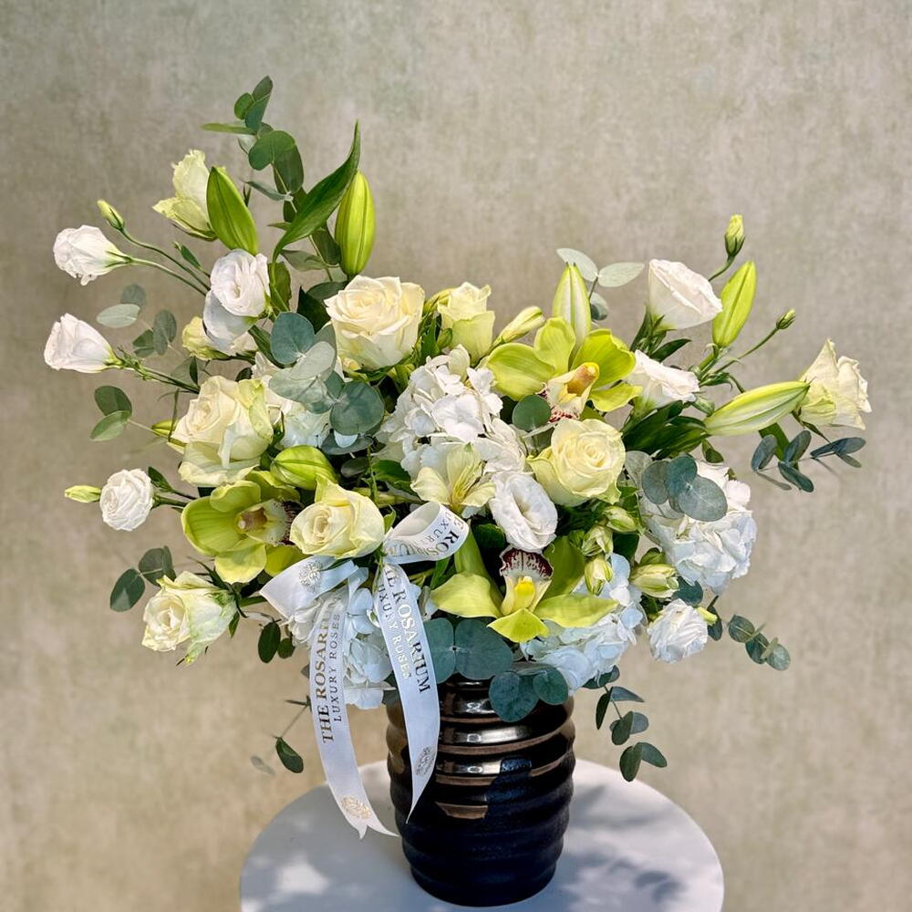 Осветите любое пространство нашим причудливым букетом Florists Special. Композиция, созданная на основе изысканной гармонии цветов, включает пышные листья эвкалипта, прекрасно сочетающиеся с нежными гортензиями и очаровательными белыми альстромериями. Яркие цимбидиумы и грациозные белые лизиантусы привносят нотку элегантности, а классические белые лилии и розы пробуждают чувство чистого, искреннего чувства. Букет искусно перевязан необычной, изящной лентой и помещен в классическую вазу, мгновенно привнося изящество и утонченность в ваш дом или офис. Элегантный, пленительный и, прежде всего, трогательный – идеальный выбор для выражения ваших самых глубоких чувств.