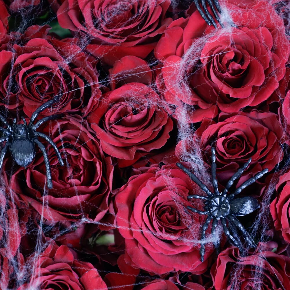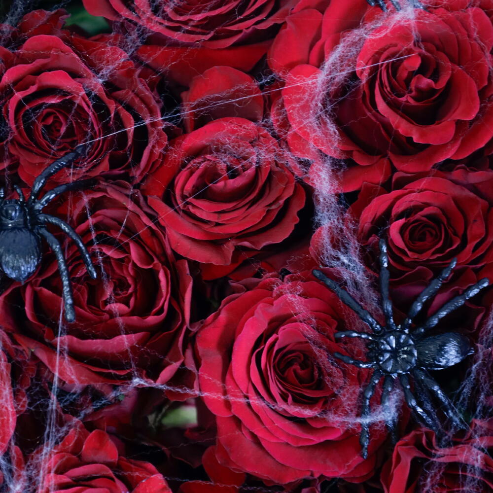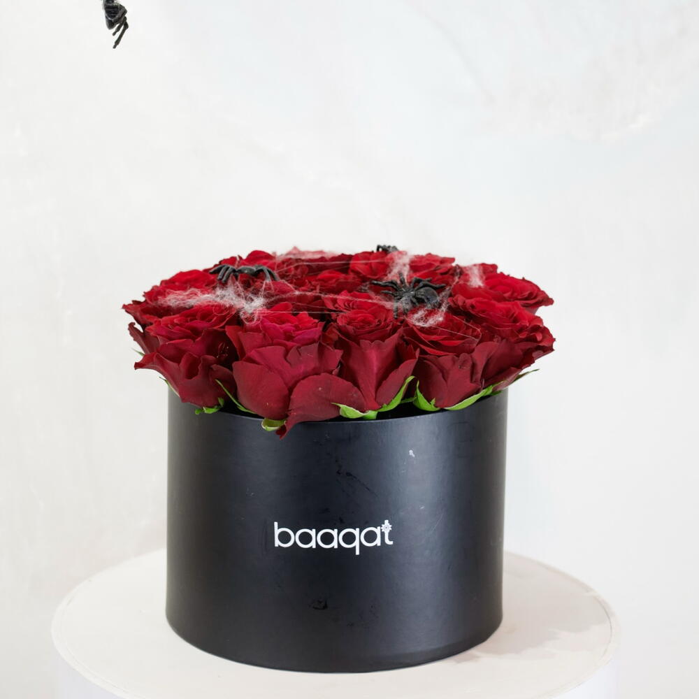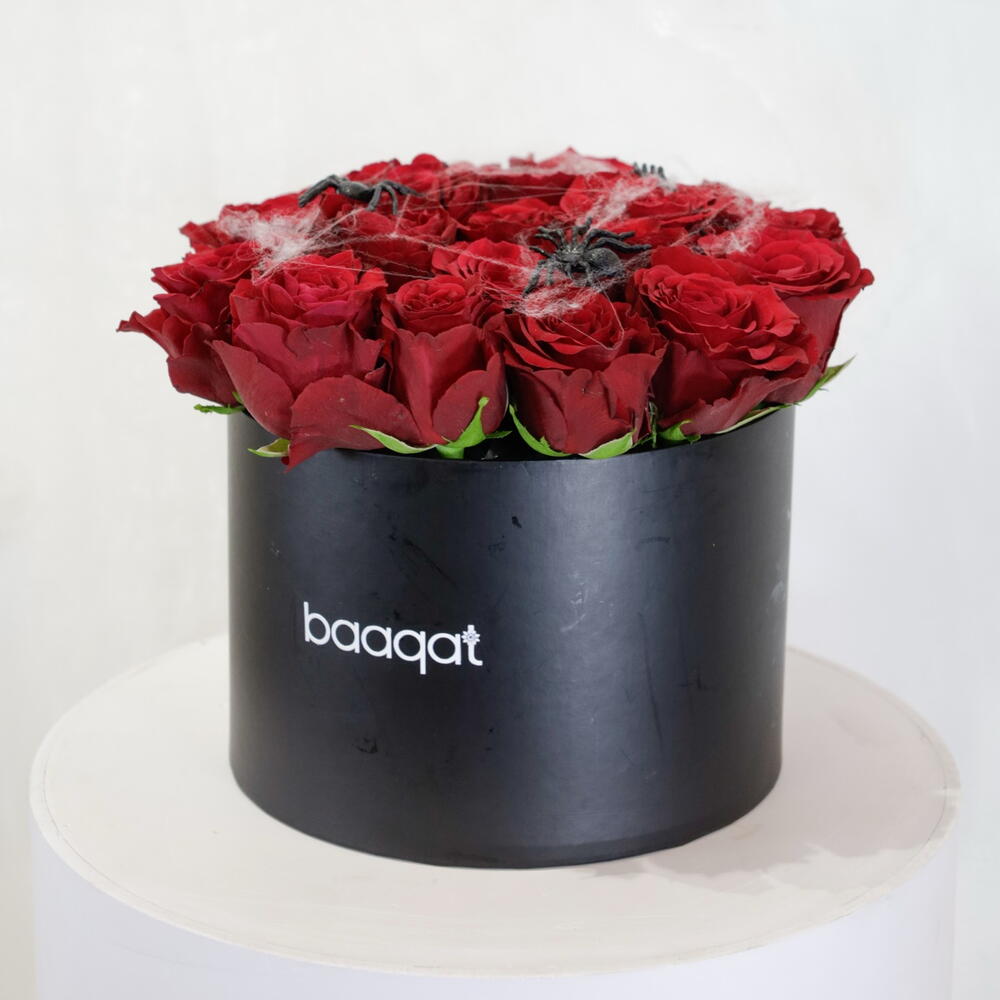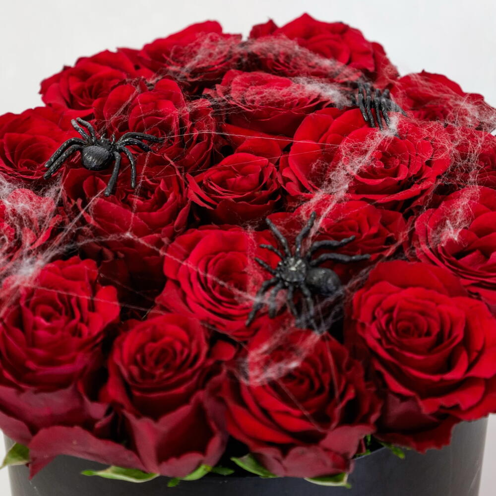 Будьте особенными в этот Хэллоуин с эксклюзивной жутко-шикарной композицией Baaqat. Эта роскошная цилиндрическая коробка глубокого чёрного цвета содержит потрясающую композицию из бархатистых, тёмно-красных роз премиум-класса. Композиция эффектно дополнена изящной искусственной паутиной и россыпью ползучих пауков, свисающих с лепестков, что добавляет ей нотку зловещей элегантности. Это стильное и эффектное украшение для вечеринки в честь Хэллоуина, изысканный подарок для поклонника фильмов ужасов или потрясающе красивое украшение для вашего дома. Приготовьтесь к очарованию... и лёгкому испугу. Инструкция по уходу за цветами Ежедневный полив: Внимательно проверяйте состояние флористической пены каждый день. Аккуратно налейте немного свежей холодной воды прямо на пену, следя за тем, чтобы вода не переливалась и не переливалась через края коробки. Пена должна оставаться влажной, но не мокрой насквозь. Местоположение: Разместите коробку вдали от прямых солнечных лучей, сквозняков из открытых окон или вентиляционных отверстий кондиционера, а также источников тепла, таких как радиаторы или электроприборы. Лучше всего поддерживать прохладную, постоянную температуру в помещении. Опрыскайте паутину: не распыляйте воду непосредственно на лепестки роз или пластиковых паучков, но лёгкое опрыскивание окружающего пространства поможет повысить влажность. Наслаждайтесь: немедленно удалите все лепестки, которые начинают увядать или желтеть, чтобы сохранить безупречный вид композиции.