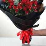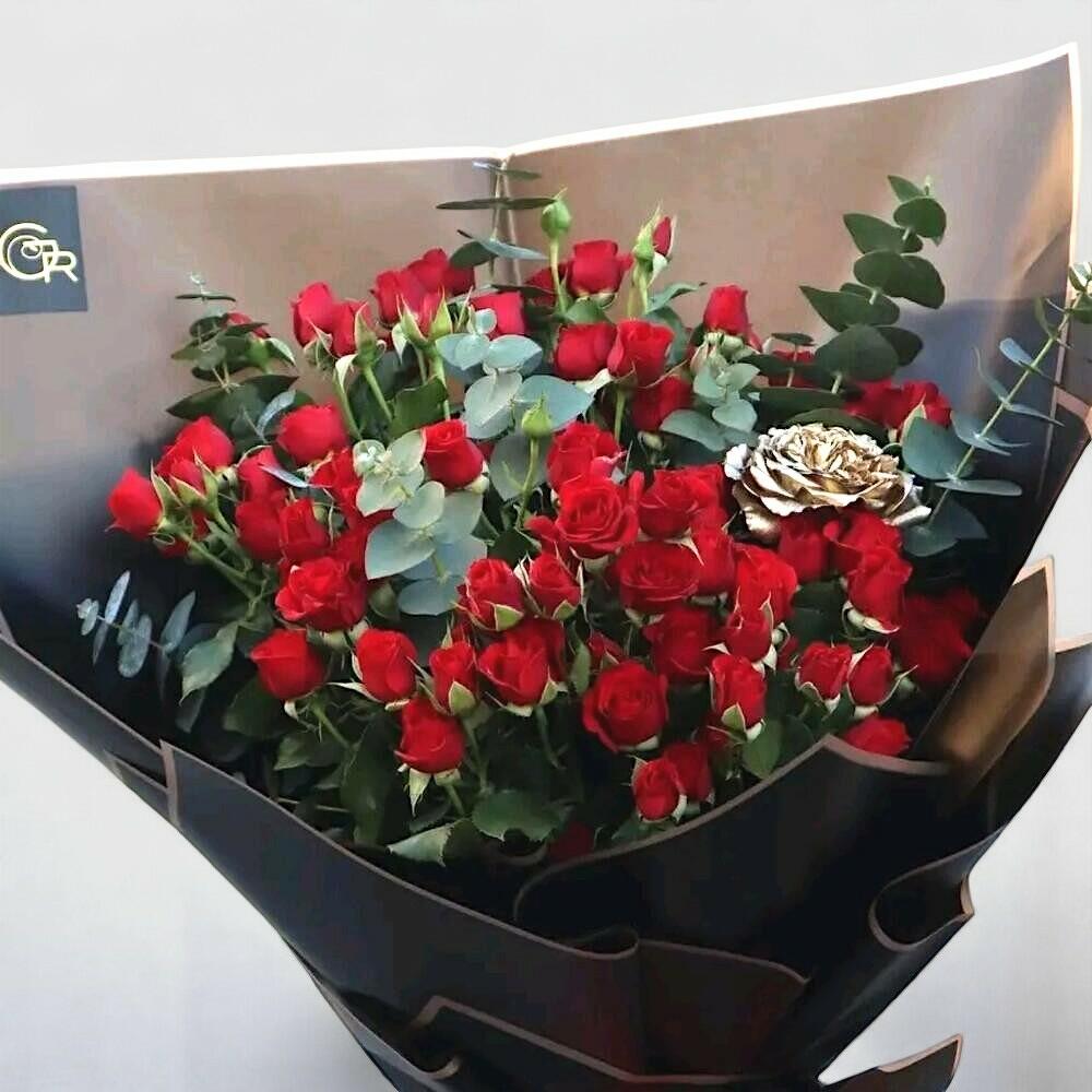 Этот потрясающий букет миниатюрных красных роз — смелое и романтичное заявление, идеально упакованный в стильную чёрную бумагу с яркой красной лентой. Дополненный изящными веточками эвкалипта и одной розой, окрашенной в золото, он сочетает в себе роскошь и вечную красоту. Идеален для грандиозных романтических жестов, юбилеев или особых торжеств, этот букет превращает любой момент в незабываемое воспоминание. Чтобы цветы дольше оставались свежими, срежьте стебли под углом, заменяйте воду каждые 2 дня и избегайте прямых солнечных лучей или экстремальных температур.
