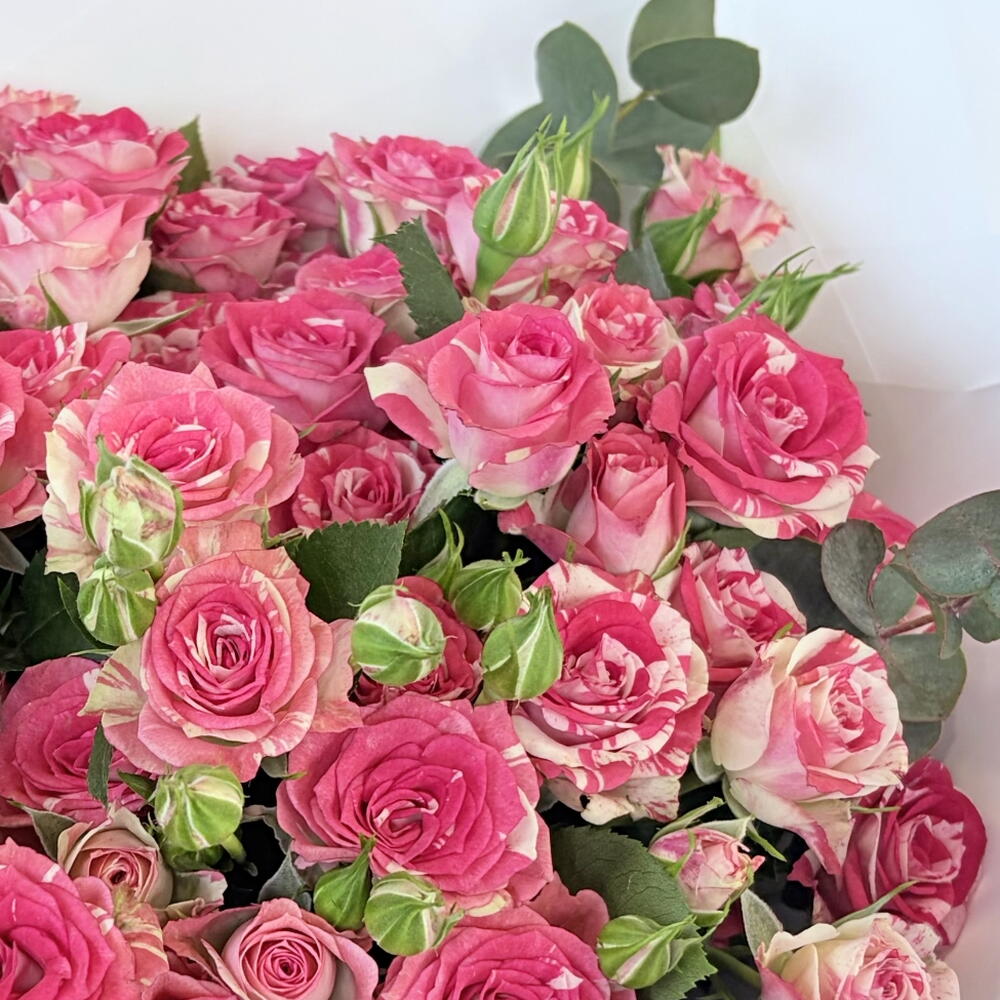 Make a statement with our "Marble Rose" bouquet. Featuring premium fuchsia and cream bi-color spray roses, this arrangement is a masterclass in texture and color. The naturally striped petals offer a unique, artistic look that standard roses can’t match. Accented with fresh eucalyptus for a modern scent and touch of greenery, it is finished in our signature crisp white wrapping with a bold red silk ribbon.
