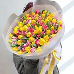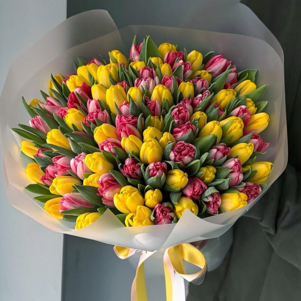 Яркий букет из 101 свежего тюльпана в сияющих красных и жизнерадостных жёлтых тонах, символизирующих страсть и радость. Эта весенняя композиция, полная энергии, идеально подходит для праздников, выражения благодарности или просто для того, чтобы поднять кому-то настроение. Упакованный в элегантную бумагу с атласной лентой, этот букет станет смелым и изящным признанием в любви.
