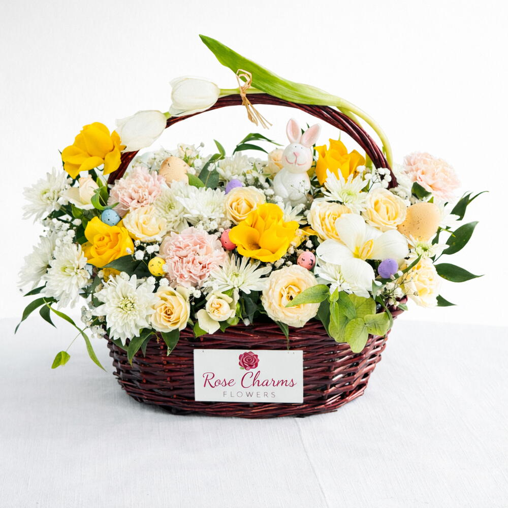 Отпразднуйте Пасху с нашей восхитительной пасхальной корзинкой «Зайчик и цветы», красиво оформленной 3 элегантными белыми тюльпанами, 4 сияющими желтыми розами, 3 нежно-персиковыми кустовыми розами, 3 свежими белыми хризантемами, 3 изящными розовыми гвоздиками и сезонными наполнителями для создания пышного весеннего образа. Украшенная очаровательным зайчиком и 8 разноцветными пасхальными яйцами, все это заботливо упаковано в прекрасную корзинку. Эта композиция идеально подходит для подарка, праздничного декора или для того, чтобы привнести радость сезона в любое пространство. 🌷🐰🥚✨