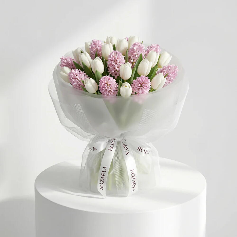 Свежий и элегантный букет, сочетающий белоснежные тюльпаны с нежно-розовыми гиацинтами. Нежный, ароматный и прекрасно сбалансированный в пастельных тонах, этот букет выглядит изысканно и поднимает настроение — идеально подходит для дней рождения, весенних подарков и нежных романтических жестов.