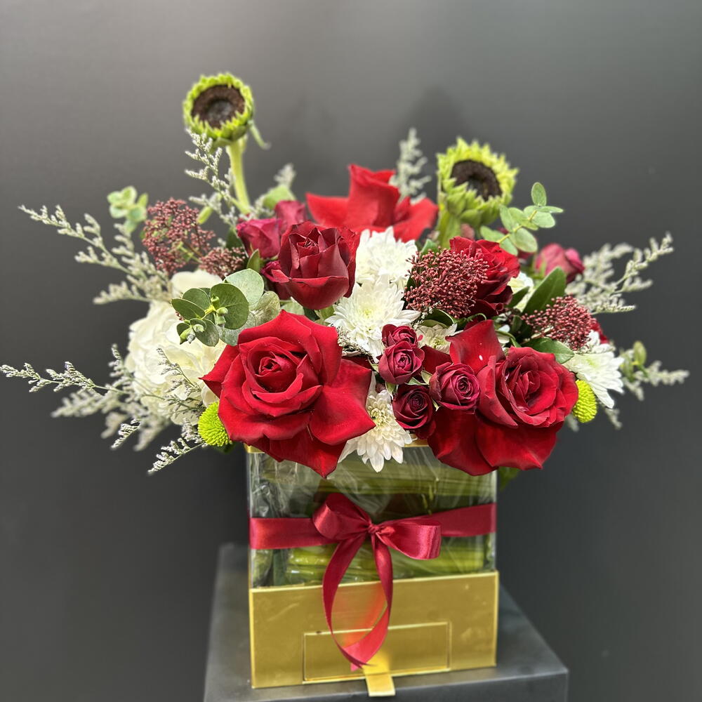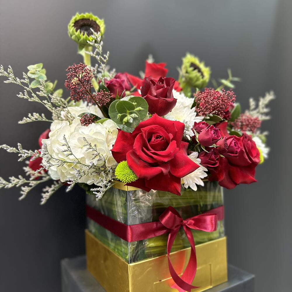 Квадратная коробка с 1 розой, 24 каспиями и 2 хризантемами за 4 399 дирхамов ОАЭ