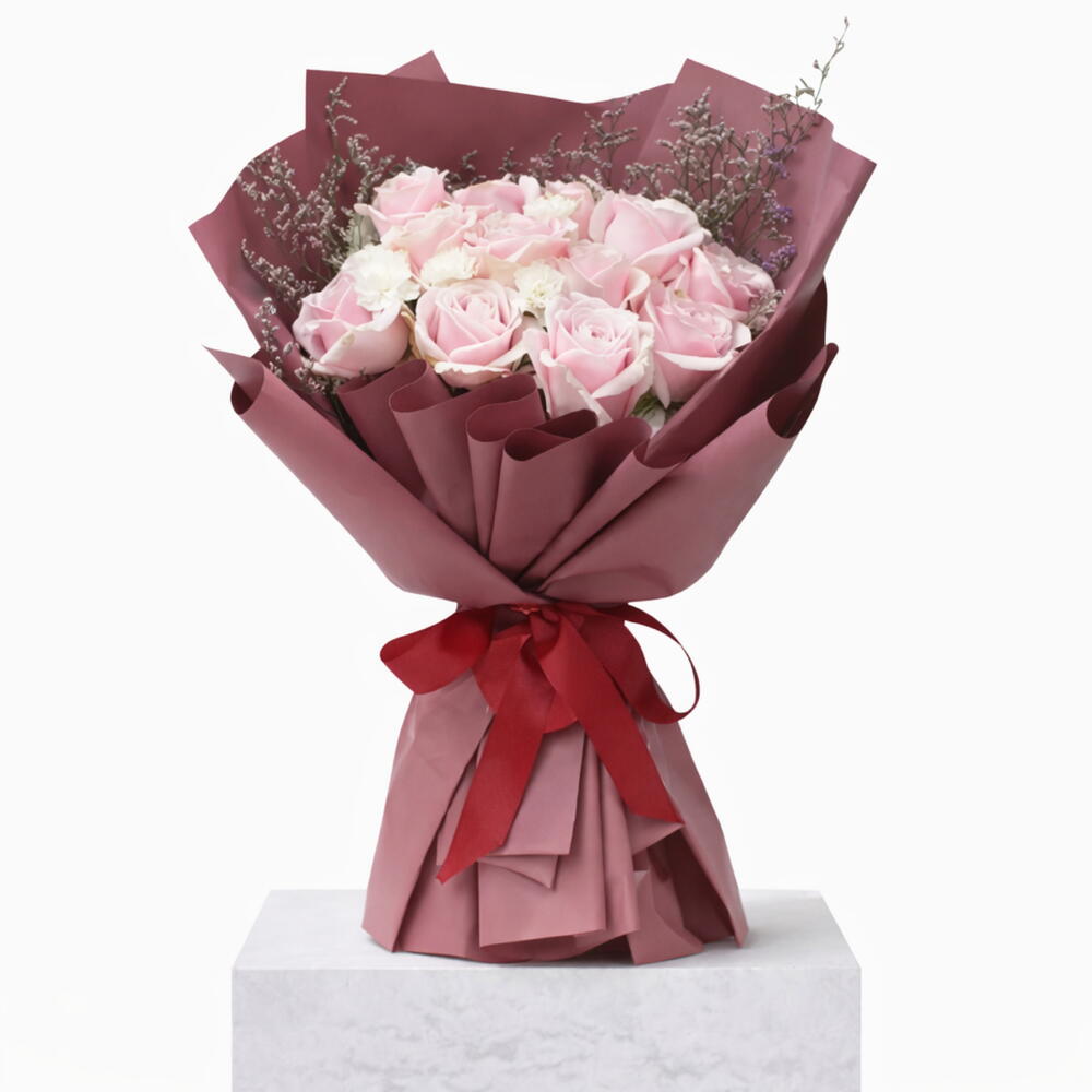 Pink rose - 12 шт. розовый лимониум - 1 шт. белый гвоздика - 5 шт.